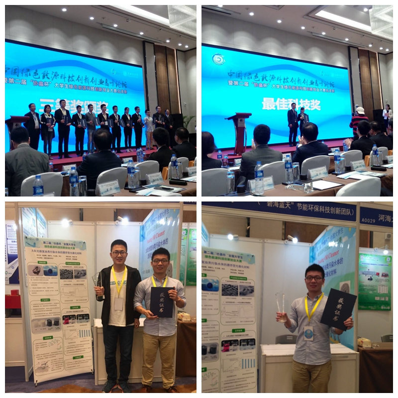 瓜子tv 倪凌峰等同学在李轶老师指导下,以作品“用于可见光原位修复油类污染水体的漂浮型光催化材料”荣获大赛三等奖;蔡炎等同学在陈卫老师指导下,以作品“一种低能耗强磁分离除藻净水工艺及藻醇发电装置”荣获本次大赛“最佳科技奖”。