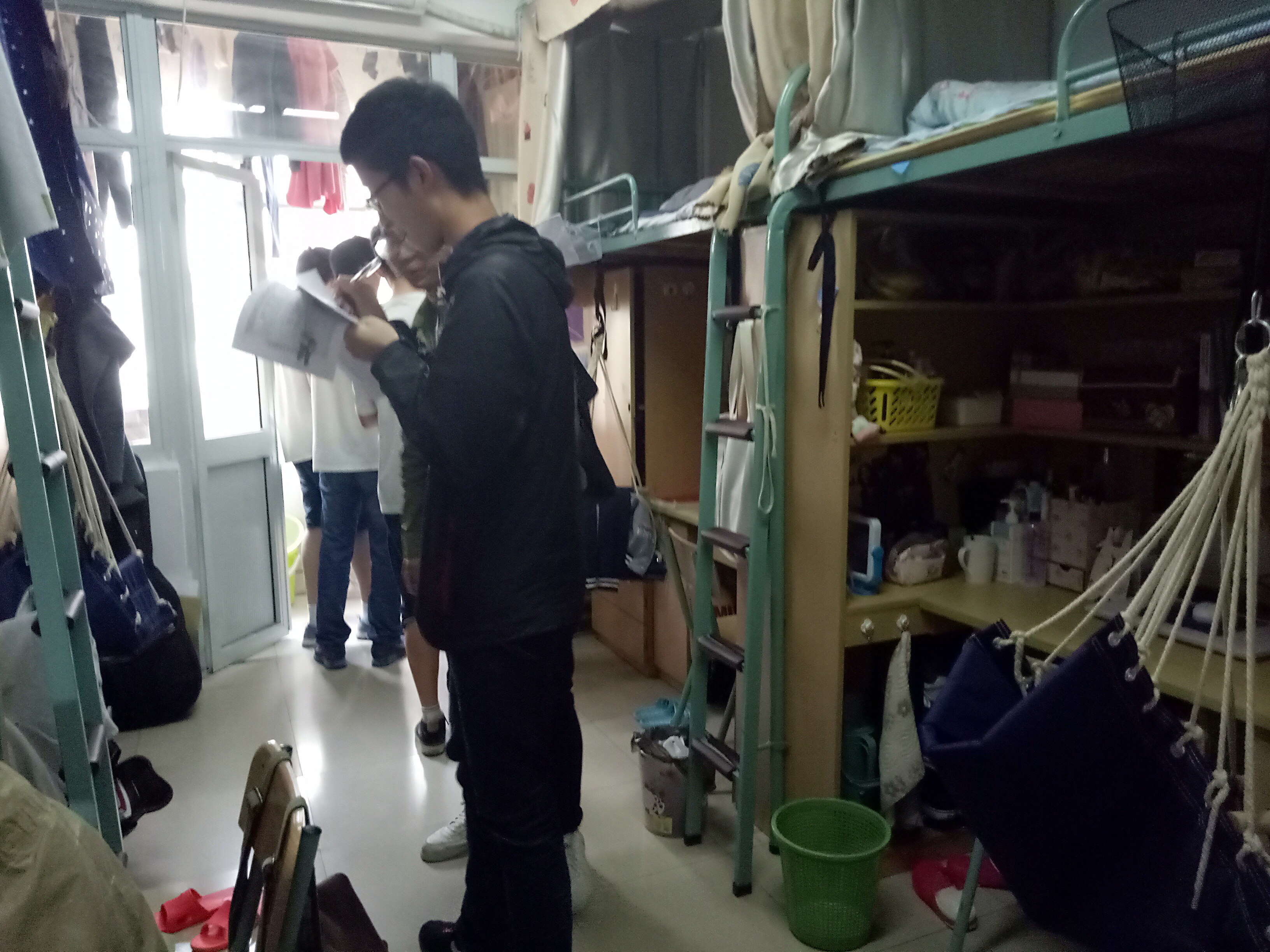 在15级辅导员王剑老师和16级辅导员金意倩老师的带领下,各打分员进入骏园二全、四书及教学区五舍、十舍的男女生宿舍参观学习环境院同学们的宿舍的布置情况。并在参观后,综合床位整洁情况、阳台、卫生间,地面干净程度等不同情况给出评分。