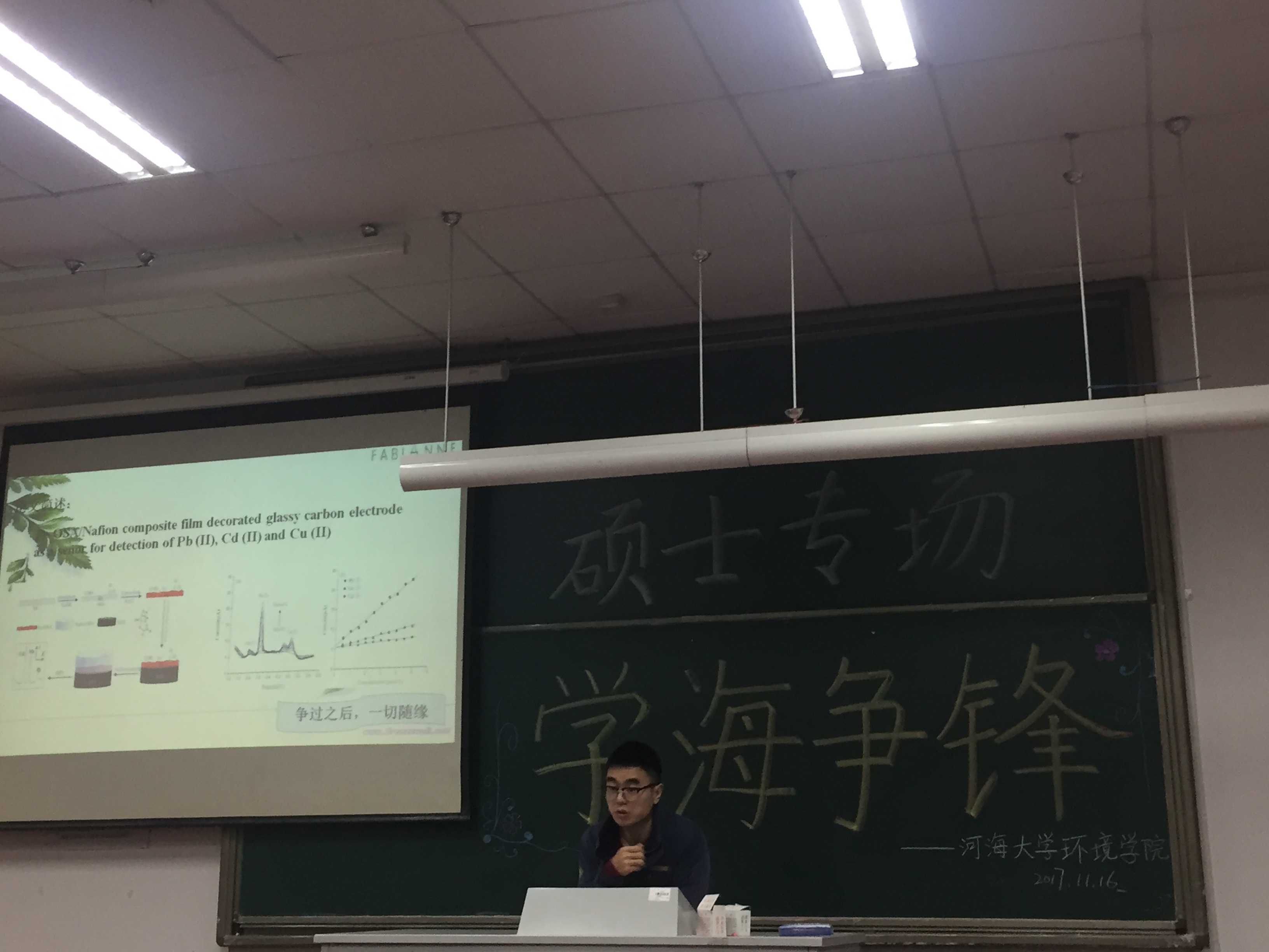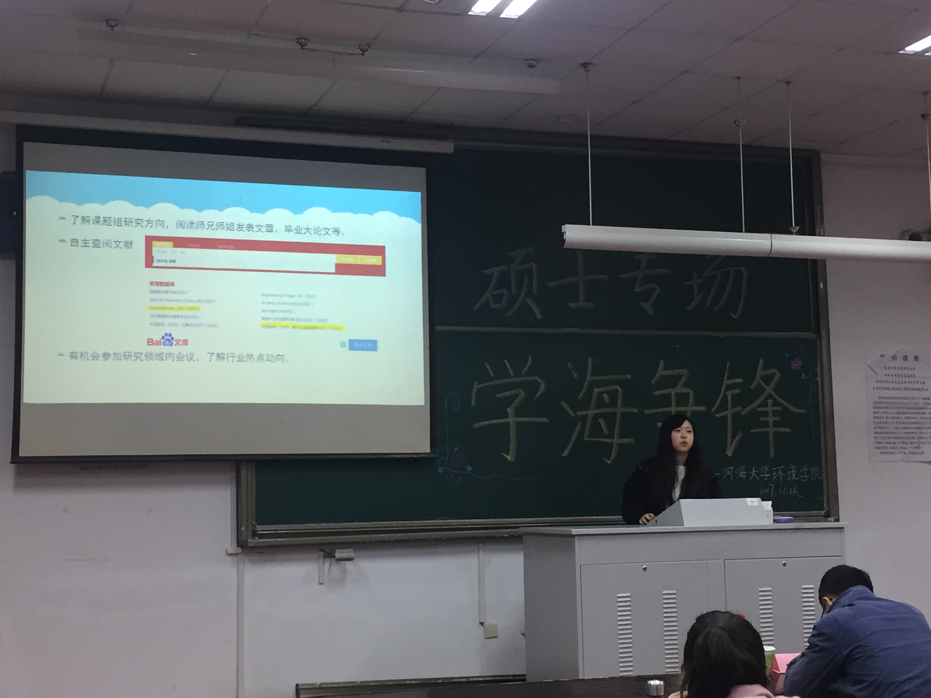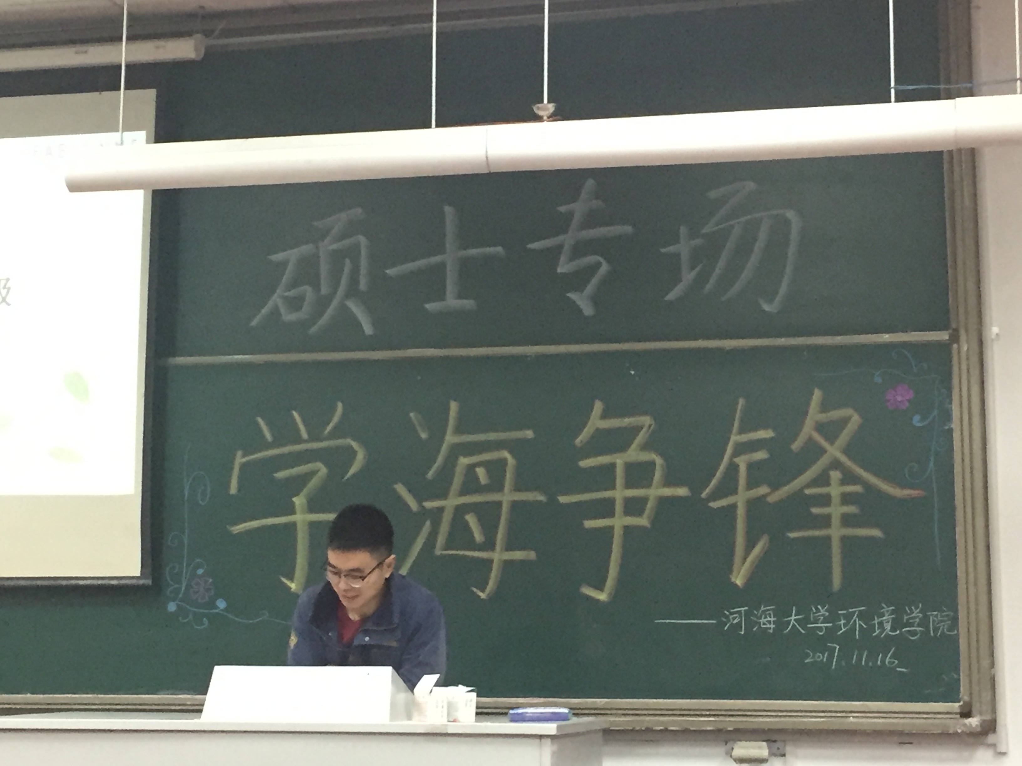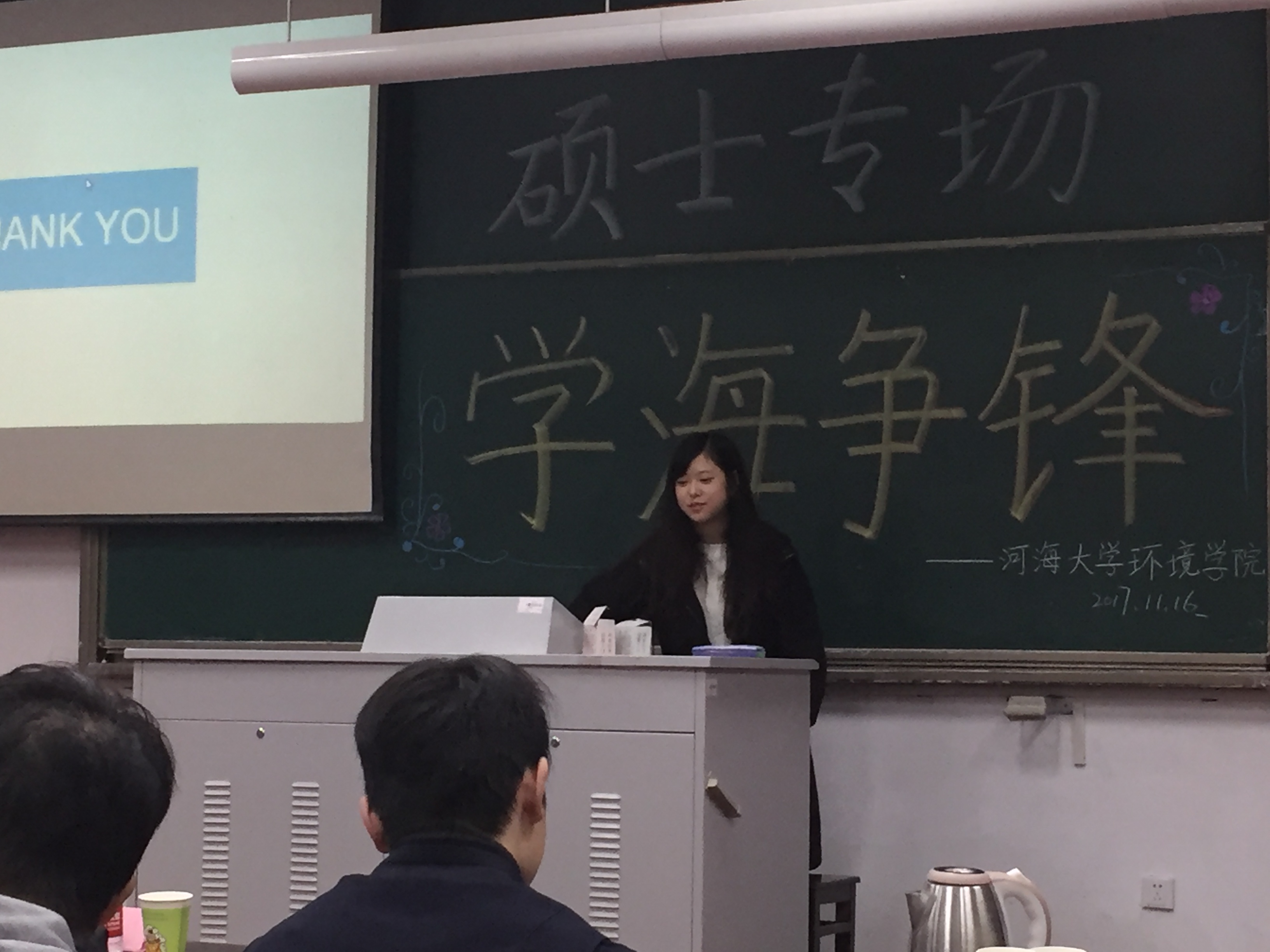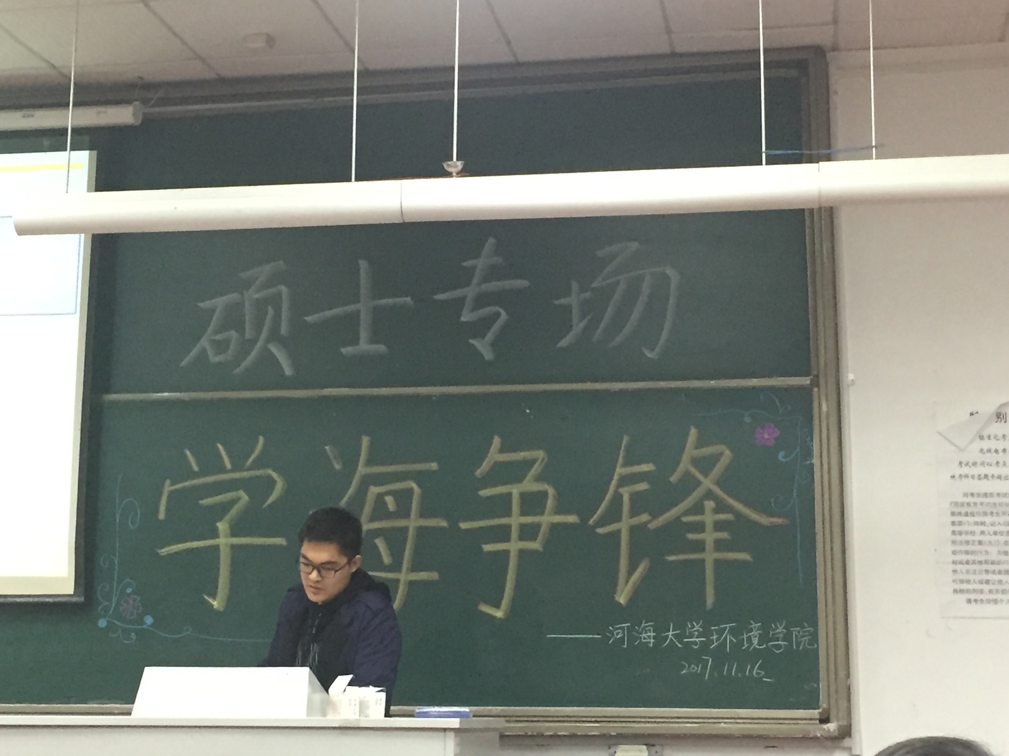 2017年11月16日下午,由瓜子tv 研会研科协策划并举办的“学海争锋——硕士专场”学术讲座于水利馆B101教室举行。本次讲座的三位主讲均是瓜子tv 优秀的研究生,都是今年国家奖学金的获得者,分别是16级市政工程专业的曹臻、15级市政工程的张佳男、15级环境科学与工程的沙海涛。