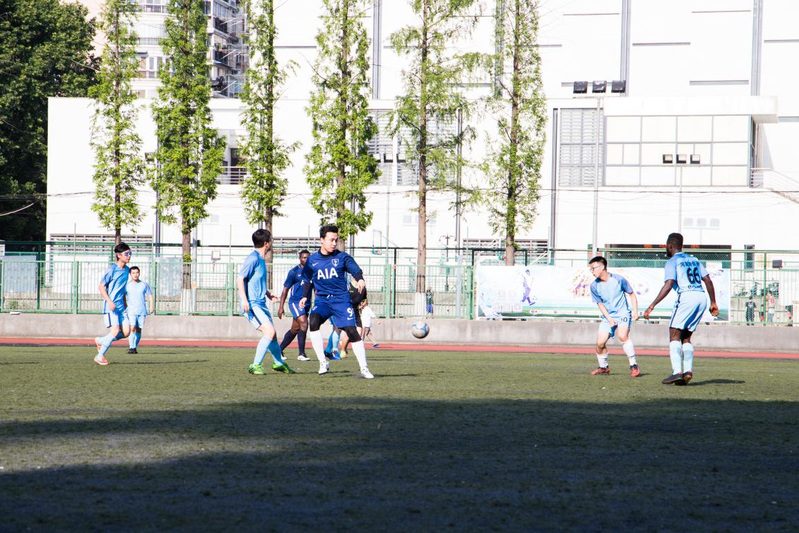 上场之前队员们在场上进行了充分的热身运动。比赛一开始,环境院就占据主动优势,连续的进攻打得上届冠军港航院无力招架。上半场快结束时环境院赢得了一个任意球机会,由77号Robert主罚。裁判哨音刚落,Robert大力抽射直挂球门死角,帮助环境院取得了领先!