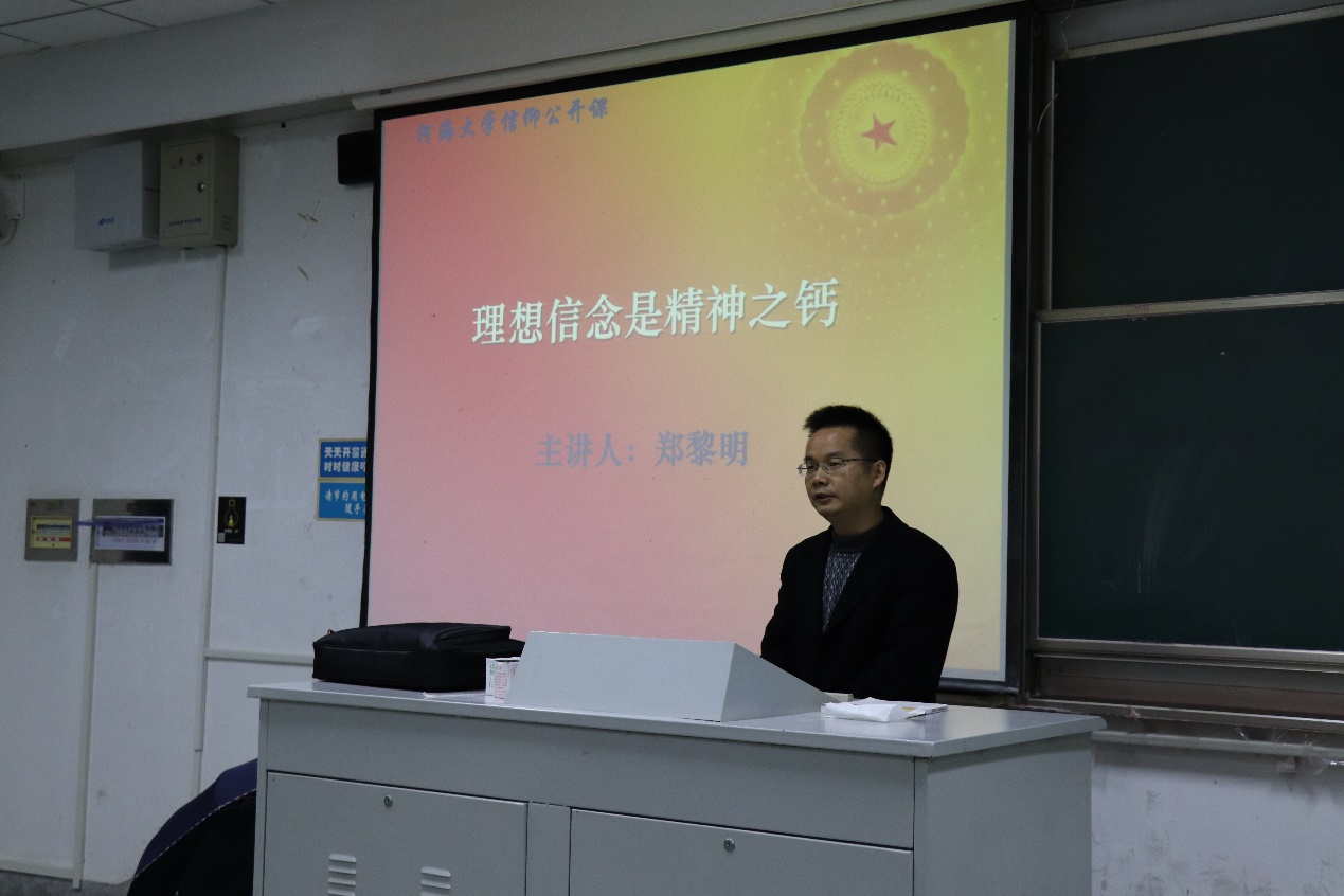 2018年12月4日3:50,瓜子tv 在致高A116教室举办“信仰公开课”系列讲座。本次讲座邀请了瓜子tv 马克思主义学院的郑黎明副教授作为主讲人,郑教授围绕“理想信念是精神之钙”这一主题,从其内涵等方面讲述了信念对于当代大学生的重要性,并且为同学们今后的学习和生活提出了一些建议。