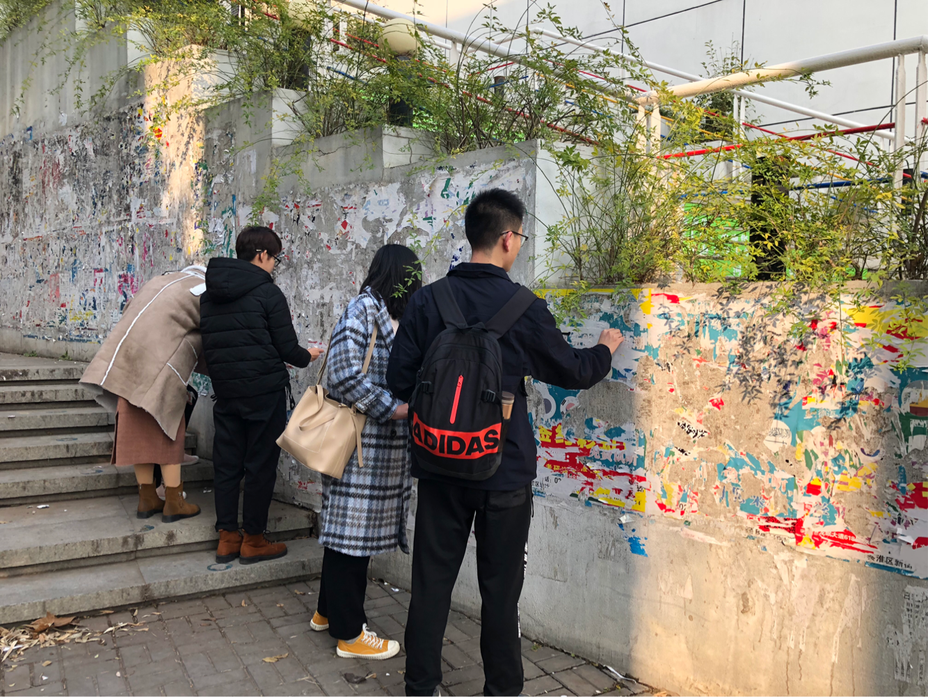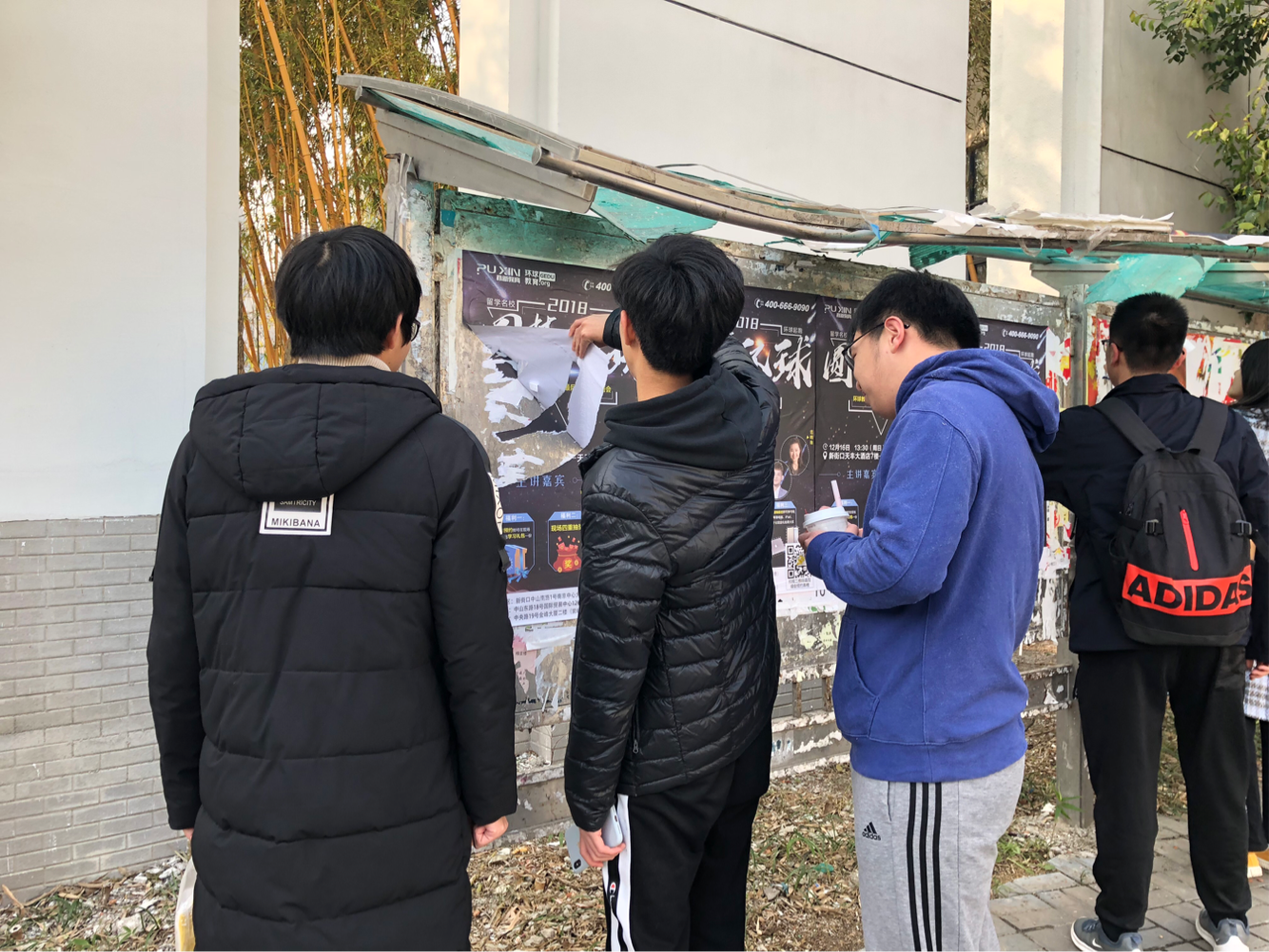 同学们分成了两组,一组将广告栏中的过时海报揭除,一组将六食堂墙上真假难辨的非官方纸张清除。尽管室外温度极低,偶尔还有萧瑟冷风吹过,在没有便捷的清理工具的情况下,同学们仍然认真地清除小广告,不放过其中任何一个。