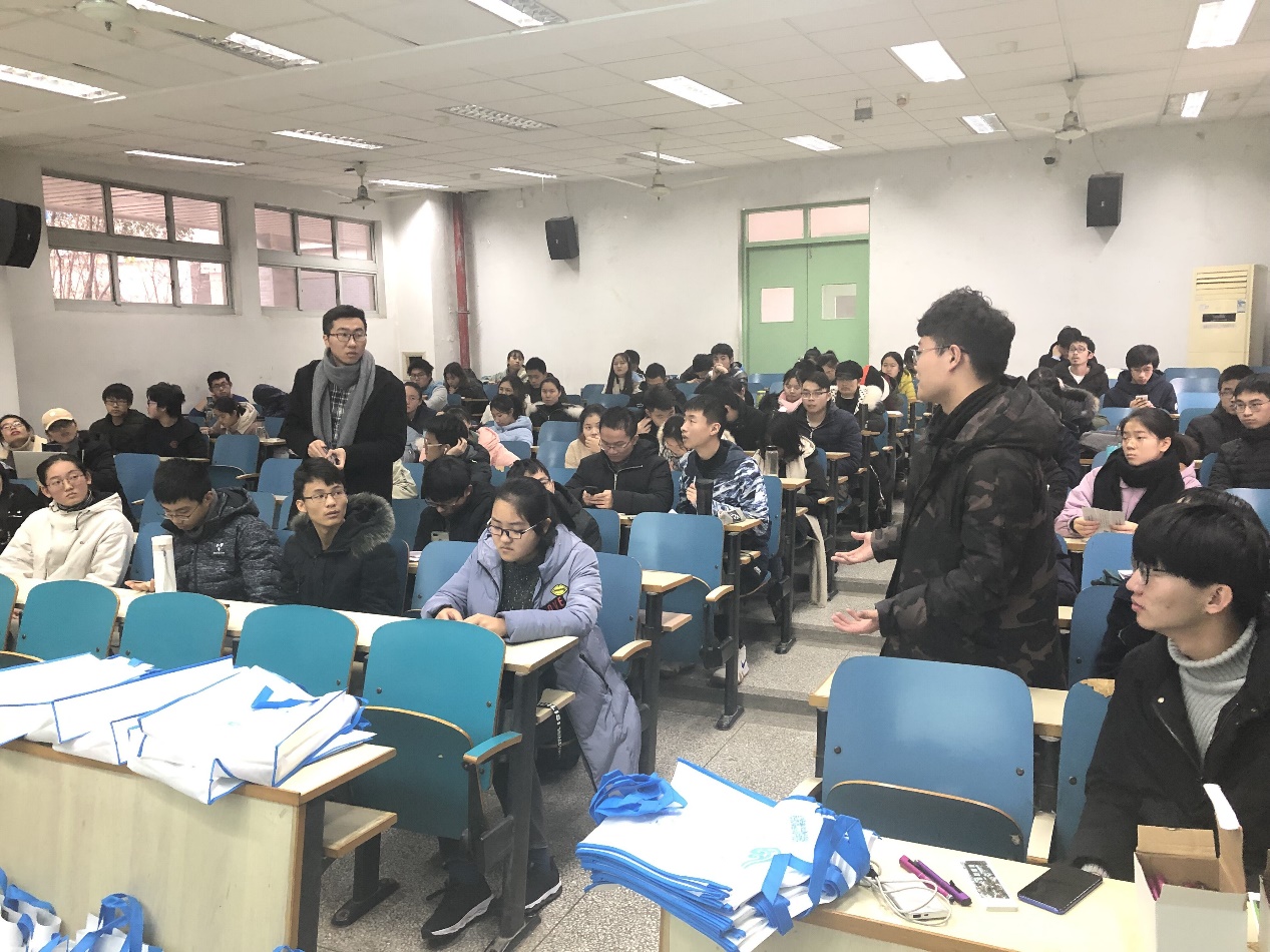 王少伟和汪涵同学则是参与了在环境院立项的团队实践。他们首先介绍了如何在回母校宣讲前做好前期准备,以应对学弟学妹和家长们的各种问题。然后他们为我们分享了物资准备经验,例如除学校提供的资料外还可以自己制作海报、书签和明信片等小礼物。此外,他们还分享了去年答辩时的PPT,并展示了优秀的申请书和策划书,让18级同学了解了如何去评选优秀实践团队。