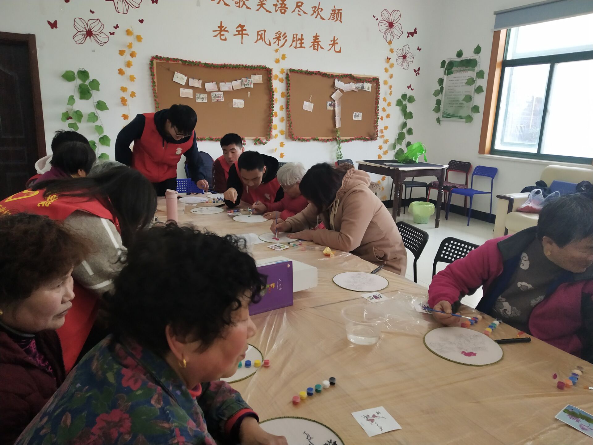 中午12点,志愿者们在东门地铁口集合,随后便乘车来到了东山街道邵圣社区居家养老服务中心。本次活动的主题是制作团扇。在老人到齐之后,志愿者们给老人们每人都分发了团扇及颜料。老人们在拿到了扇面及颜料之后,便开始了团扇的制作。老人们拿着图样,对比着效果图的颜色给扇面上色。志愿者们热心地给老人讲解着上色的方法,或是帮助着老人们在扇面上涂着各式各样的颜料。志愿者们与老人们亲切地交谈着,与老人们开心地互动,让老人们很是开心。很快,老人们的团扇便有原先单调的白色背景变成了五彩斑斓的生动画面。老人们对这次的团扇制作都十分满意。