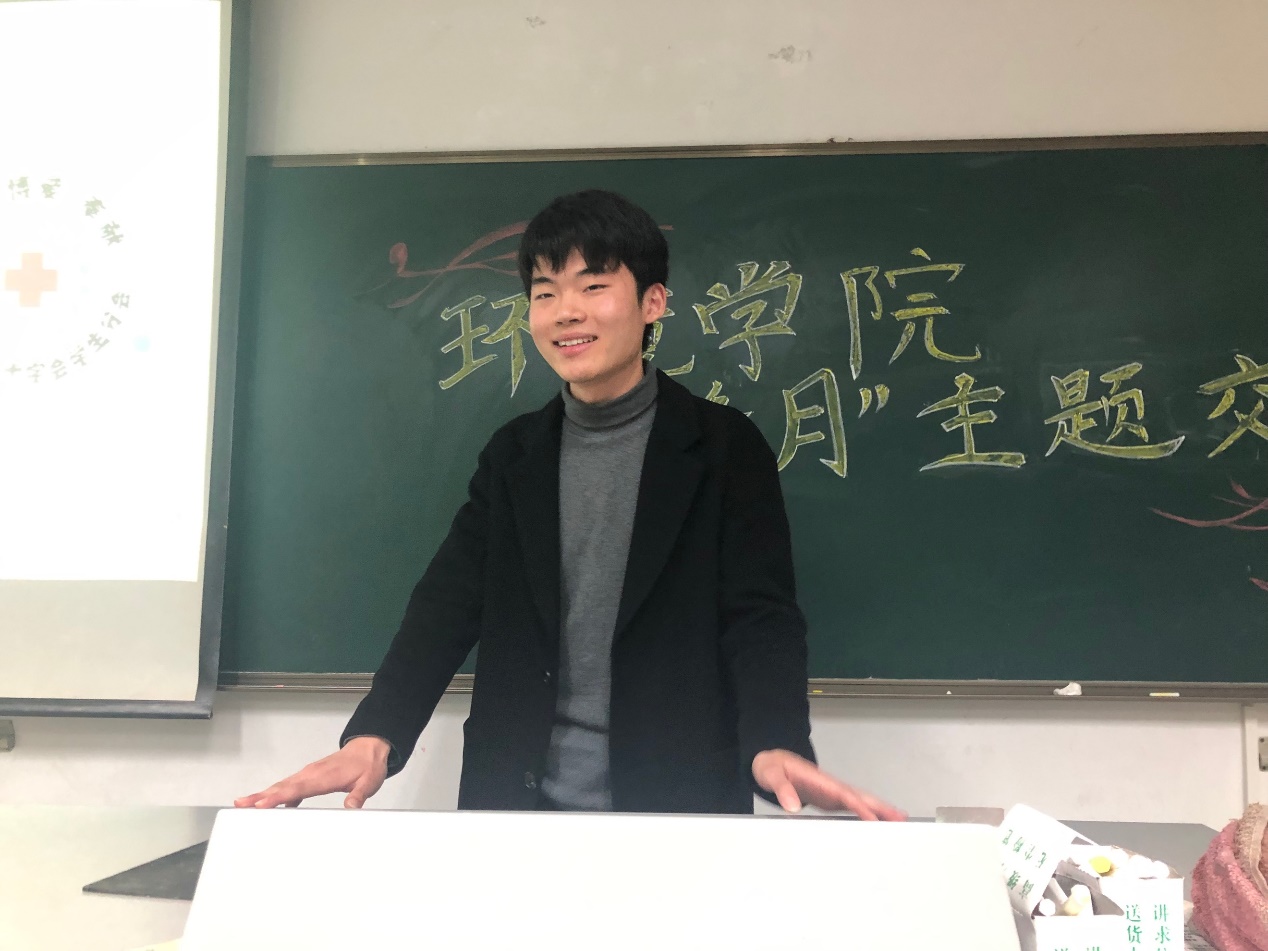 第五位是17级环境2班的何杨同学。他是一名瓜子tv 红十字会培训部的一名成员。他先向我们讲解了习近平主席对雷锋精神的表述:“信念的力量、大爱的胸怀、忘我的精神、进取的锐气”和胡锦涛同志的总结:“奉献、友爱、互助、进步”,又展示了红会培训部对禁毒和造血干细胞的科普宣传。他向我们讲述了一个让人感到温暖的故事:红会在网上购买禁毒宣传使用的设备道具时,卖家得知了他们是纯公益组织,于是免去了所有的费用。这正是真心的回馈。