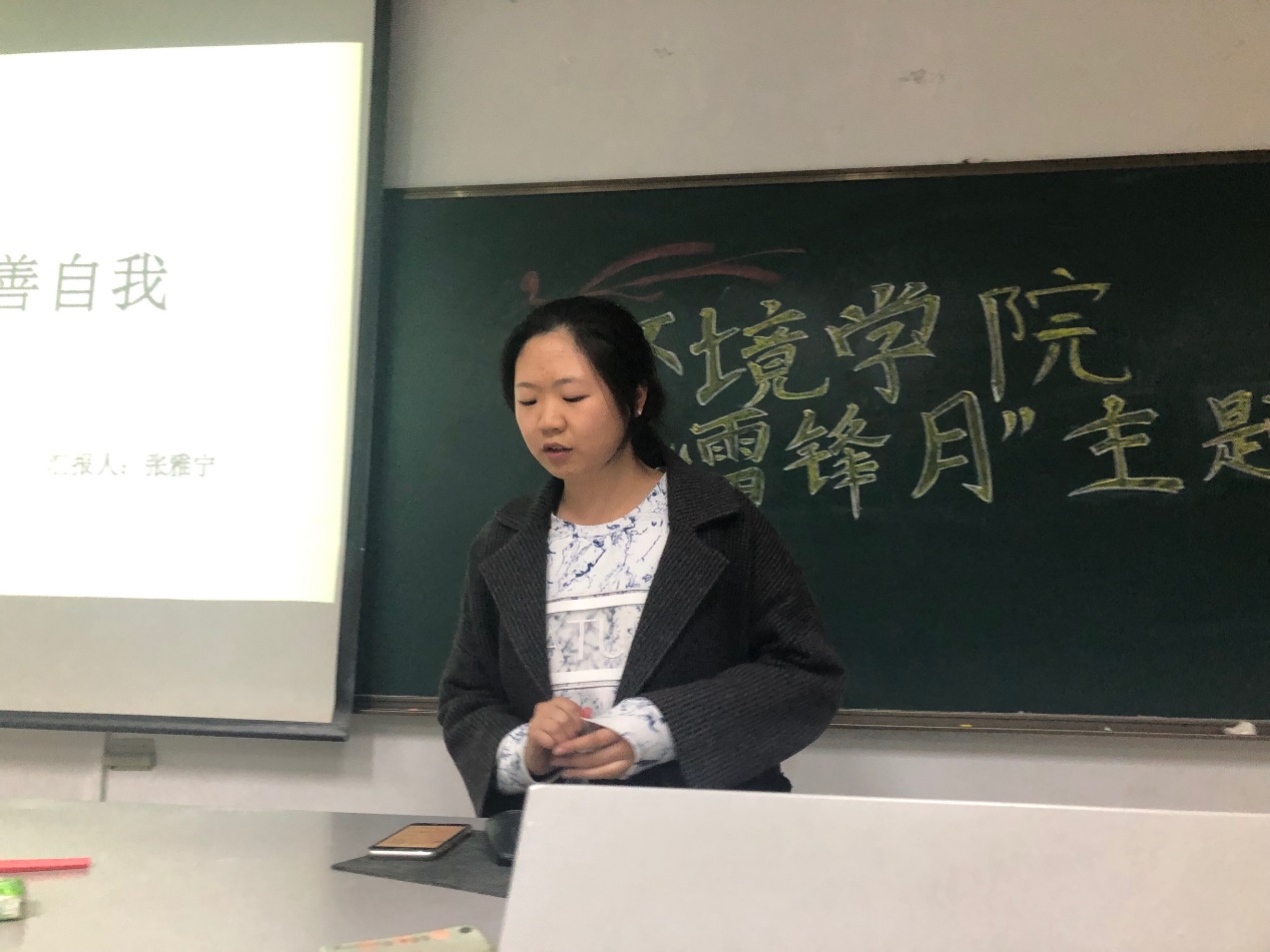 第一位向我们演讲的是17级的常成同学。她先向我们讲解了雷锋的生平。雷锋,原名雷正兴,1940年生人。1960年1月,雷锋同志入伍,同年11月雷锋加入中国共产党,由于他工作刻苦认真,仔细钻研技术,同时又乐于助人,1962年他便晋升了中士军衔,然而同年八月,雷锋同志在执行运输任务时不幸殉职,令人扼腕叹息。
