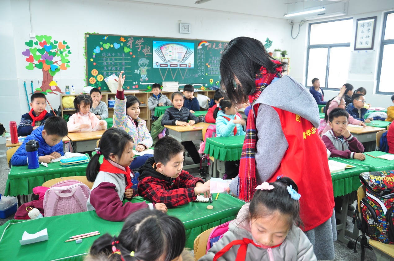 志愿者们分成了四组,一组中,一人负责讲解垃圾分类相关知识,其余三人协助讲师开展活动、维持秩序。在负责人简短交代了注意事项后,志愿者们进入了自己负责的班级。