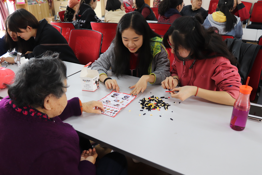 活动过程中,志愿者主动与老人们聊天,一些老人还表示十分感谢志愿者们每周六来陪他们玩耍聊天,打发他们的周六时光。一些老人因为操作不便不能一起完成积木,但也在一旁认真地看着志愿者搭放积木,还不时点头表示赞扬。在与老人交谈过程中,志愿者和老人们的关系不断拉进,还有人询问老人们喜欢怎样的活动,下次再来与老人们一起玩。