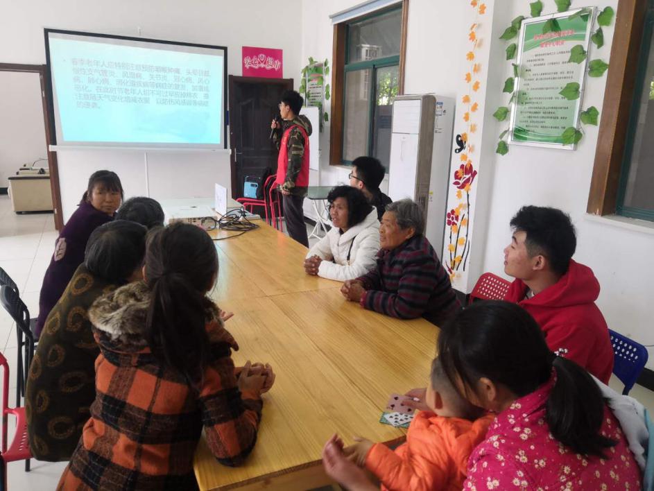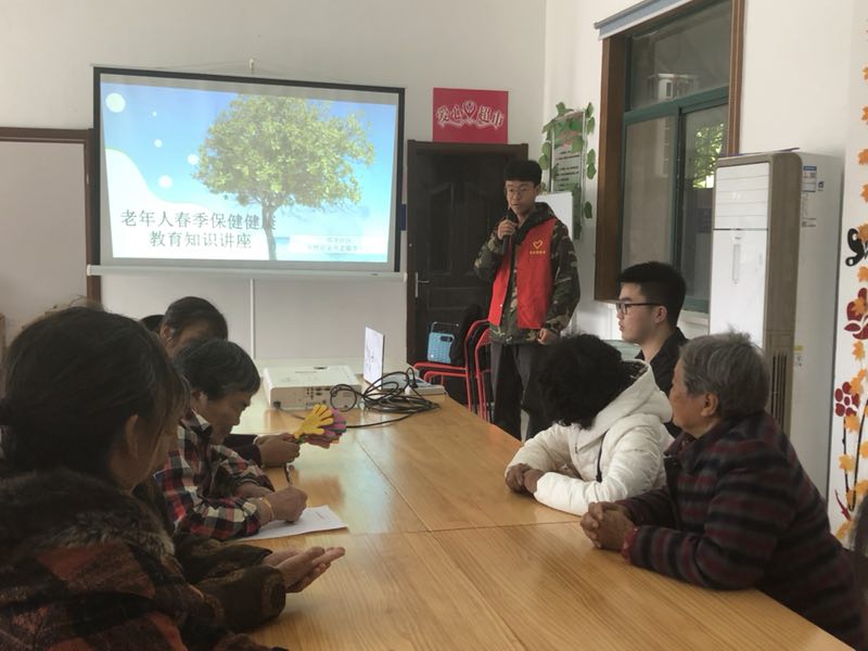 中午12时,志愿者们在东门地铁站集合,随后一起乘车前往东山街道邵圣社区居家养老服务中心。到达目的地后,志愿者们协助服务中心负责人布置好场地,并安排老人们入座。之后志愿活动负责人将“老年人春季保健健康教育知识讲座”PPT打开,活动正式开始。活动的一开始,志愿者便为老人们分发了他们准备好的肥皂,意为“勤洗手,防疾病”。老人们都开心的举起手中的奖品,配合志愿者拍照。讲座主要告诉老年人春季保健要特别注意预防伤风感冒等病症,注意睡眠充足,保持良好心情和精神状态,合理调节膳食结构,重视加强体育锻炼,增强机体免疫力等。有些老人还带了纸笔,将志愿者所讲的内容一一记下。