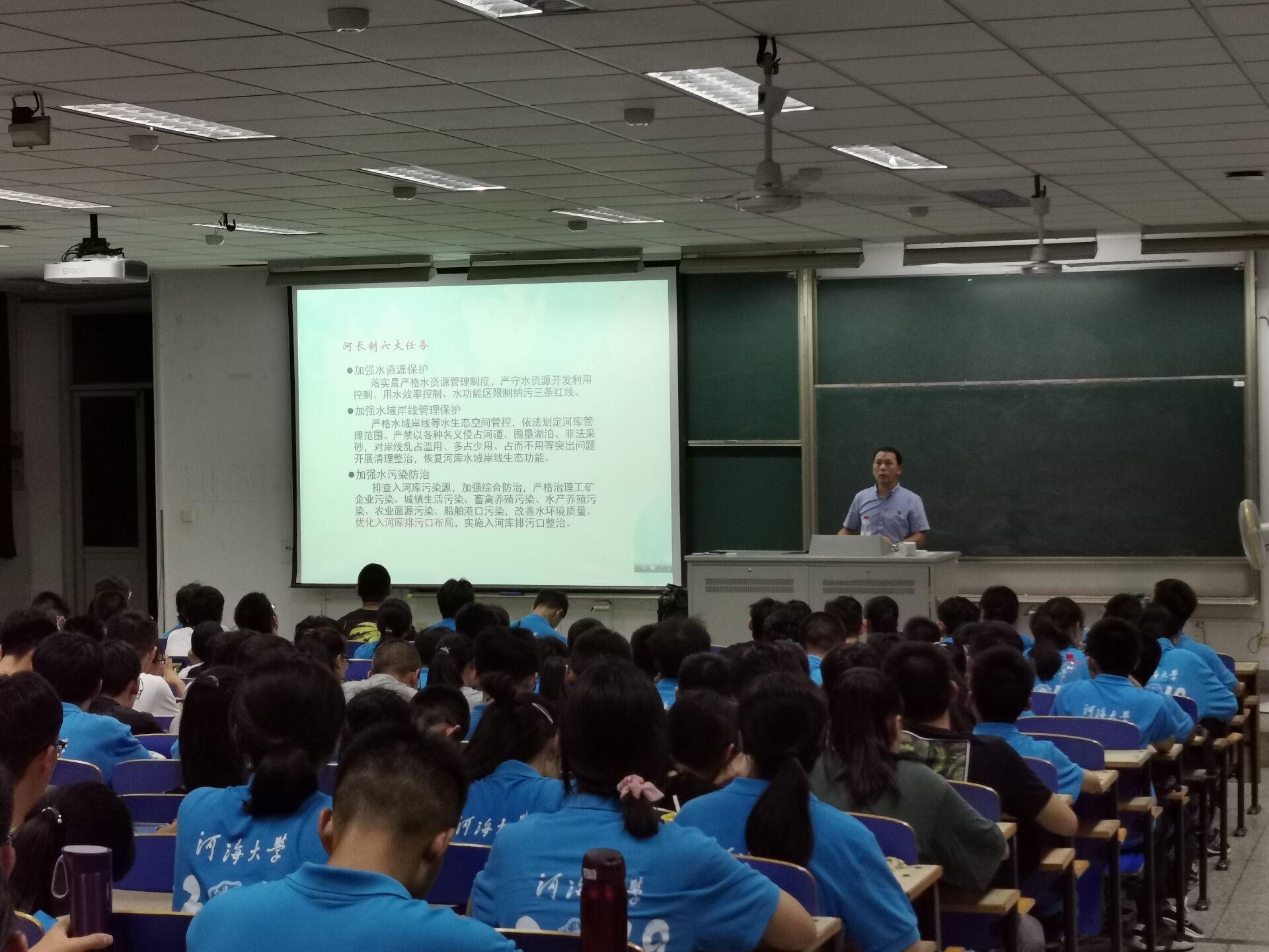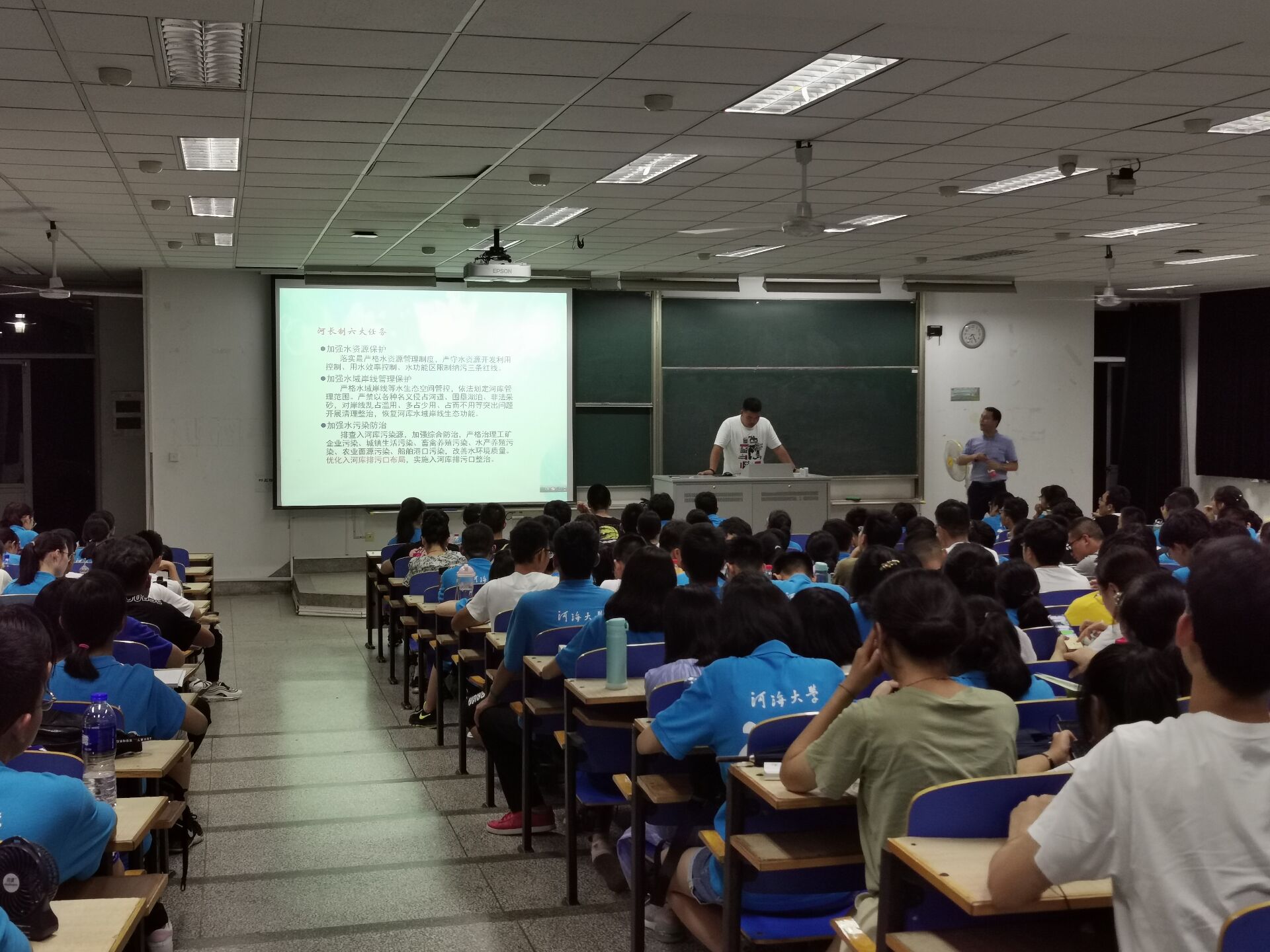 大会一开始,李老师就以喊口号的方式激发同学们的热情。随后李老师在简单的自我介绍后,开始了本次讲座。讲座期间,李老师多次与同学们互动交流,询问同学们对自己专业的认识,现场氛围十分热烈。李老师用各种数据告诉同学们瓜子tv 的优胜之处,还以近期的大型项目河长制为例子,说明在座同学的专业的优越性,增强同学们的自豪感。