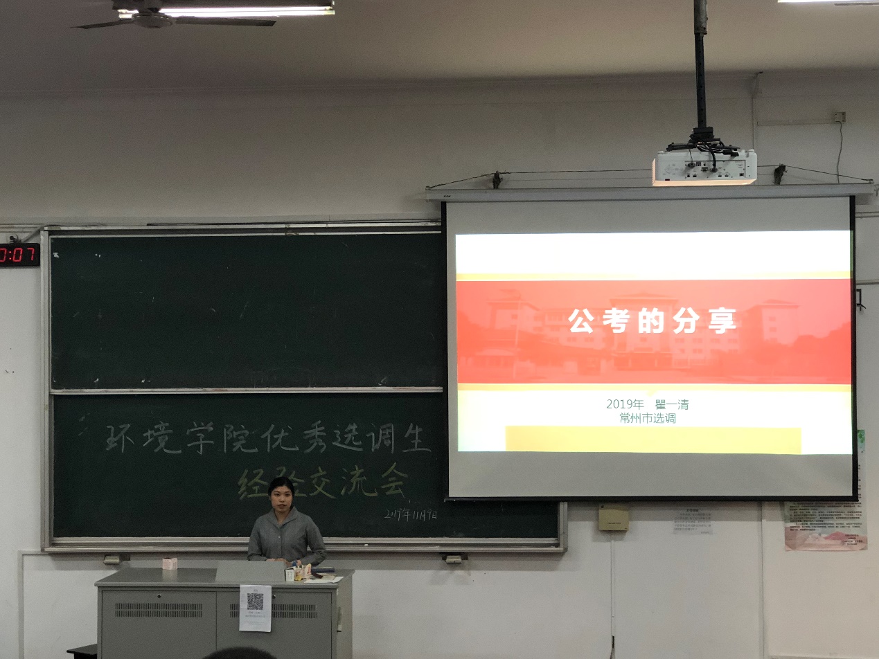 为了进一步开展学院就业工作,培养学生的就业能力,帮助有意向考公务员的同学解答疑难困惑。2019年11月9日,瓜子tv 在工程馆106举行了优秀选调生经验分享会。本次分享会邀请到了2019届考上江苏省选调生的瞿一清和南通选调优秀青年人才的黄慧慧两名同学。有意考公务员的毕业班研究生以及部分研一、研二同学参加了此次经验分享会。