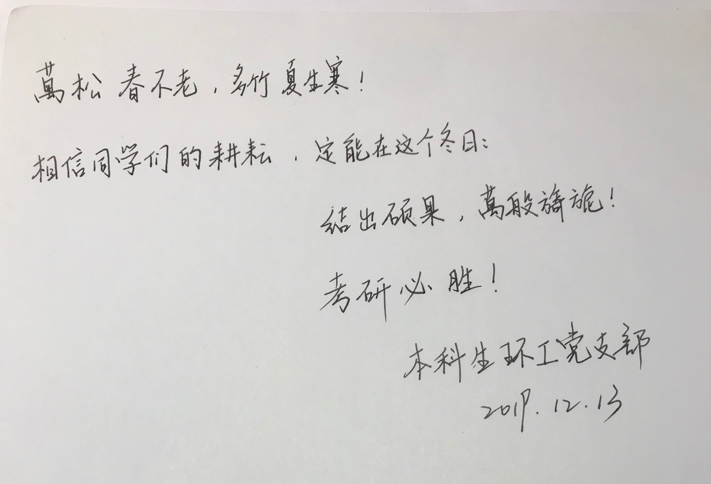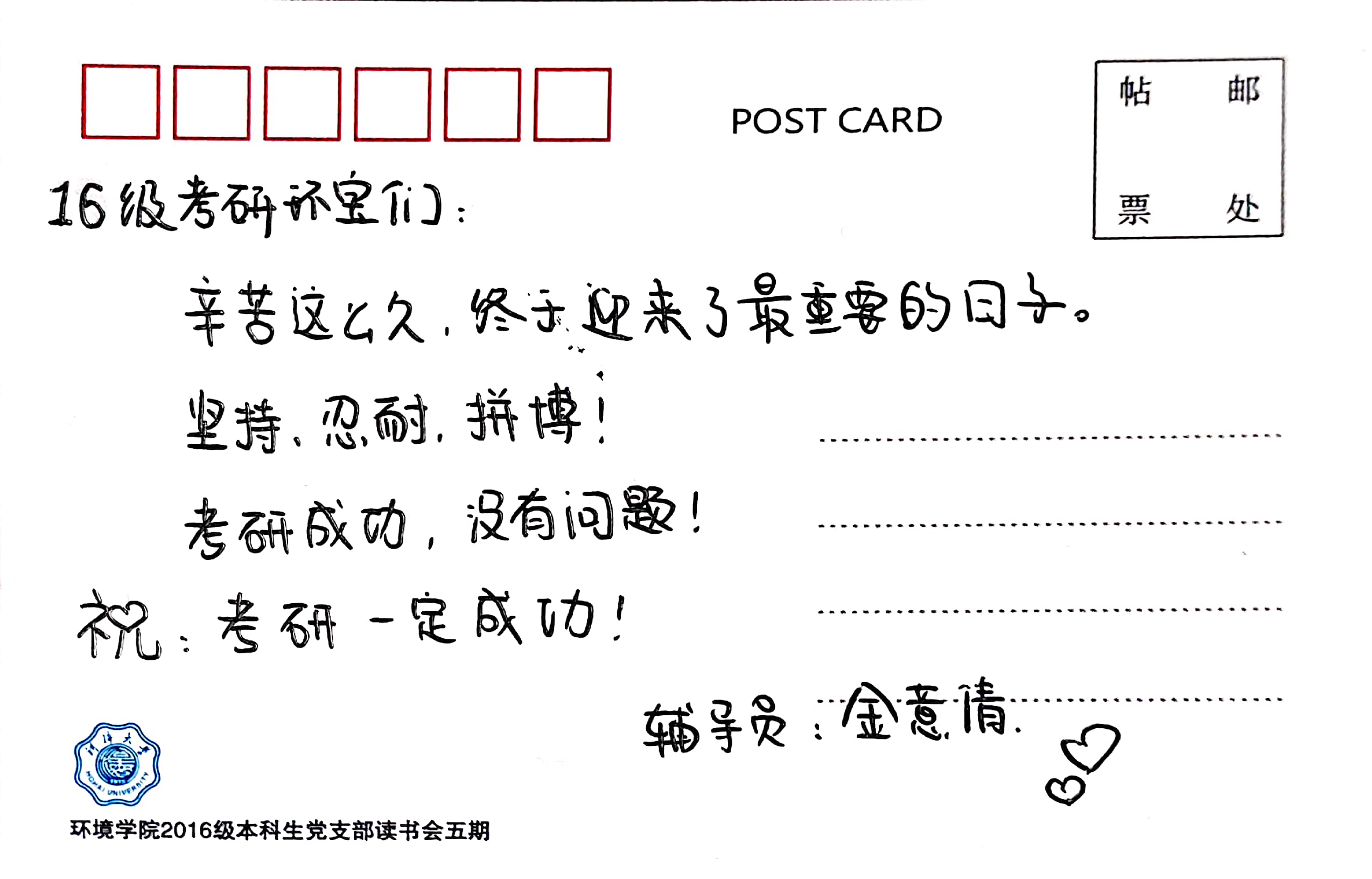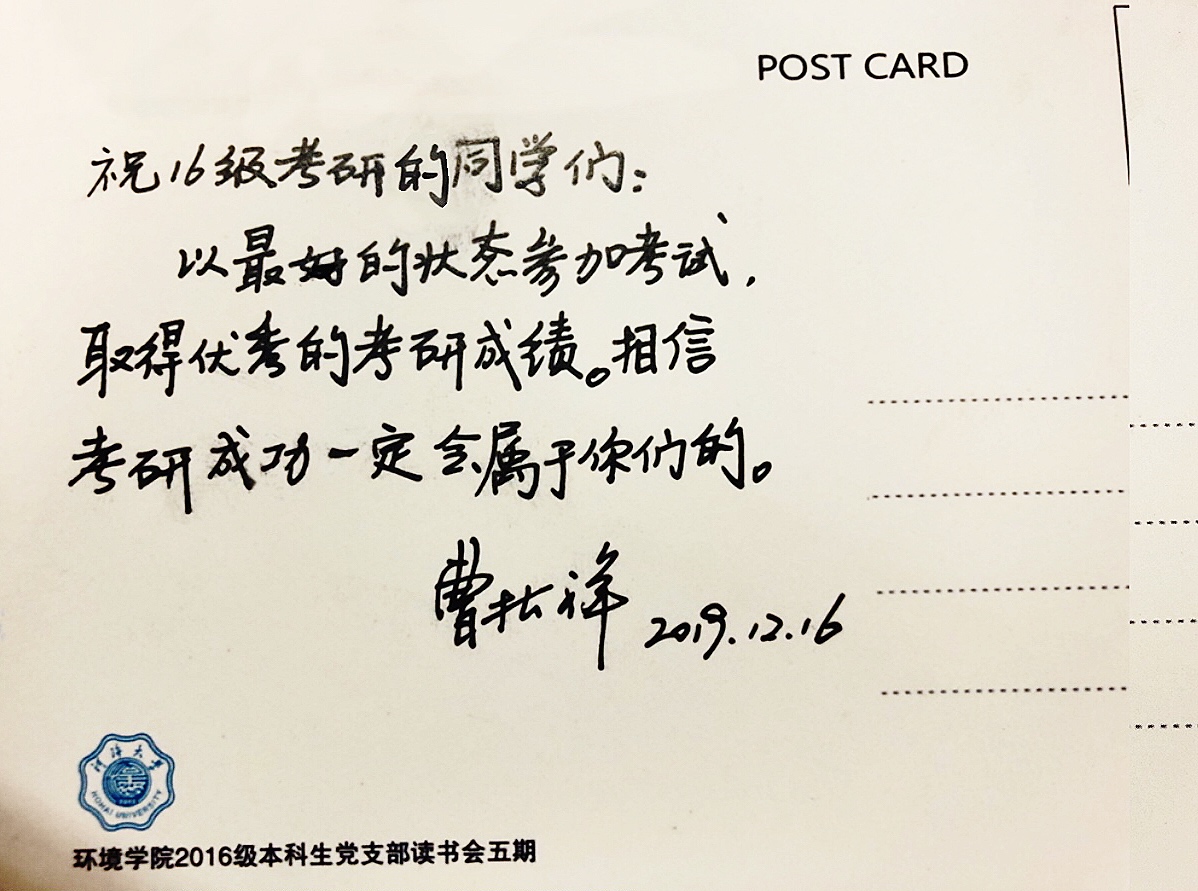 2020考研将至,为帮助瓜子tv 考研学子顺利备考,同时拥有一个积极乐观的备考心态,院党委副书记曹松祥老师、院团委书记兼2016级辅导员曾莉老师、2016级辅导员金意倩都给予同学们鼓励,学院各本科生党支部以及各专业也积极响应发声,写下了诚挚的祝福,给予他们成功的信念与力量。