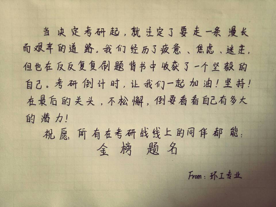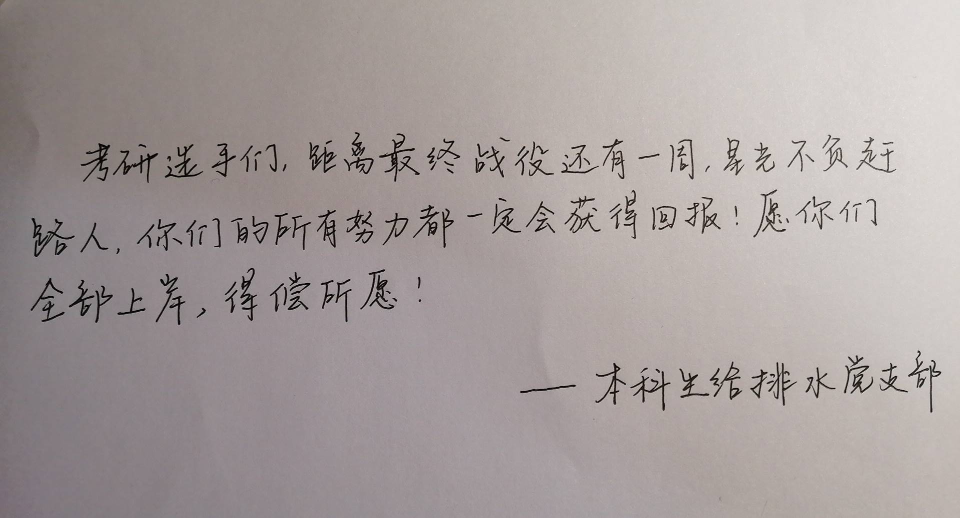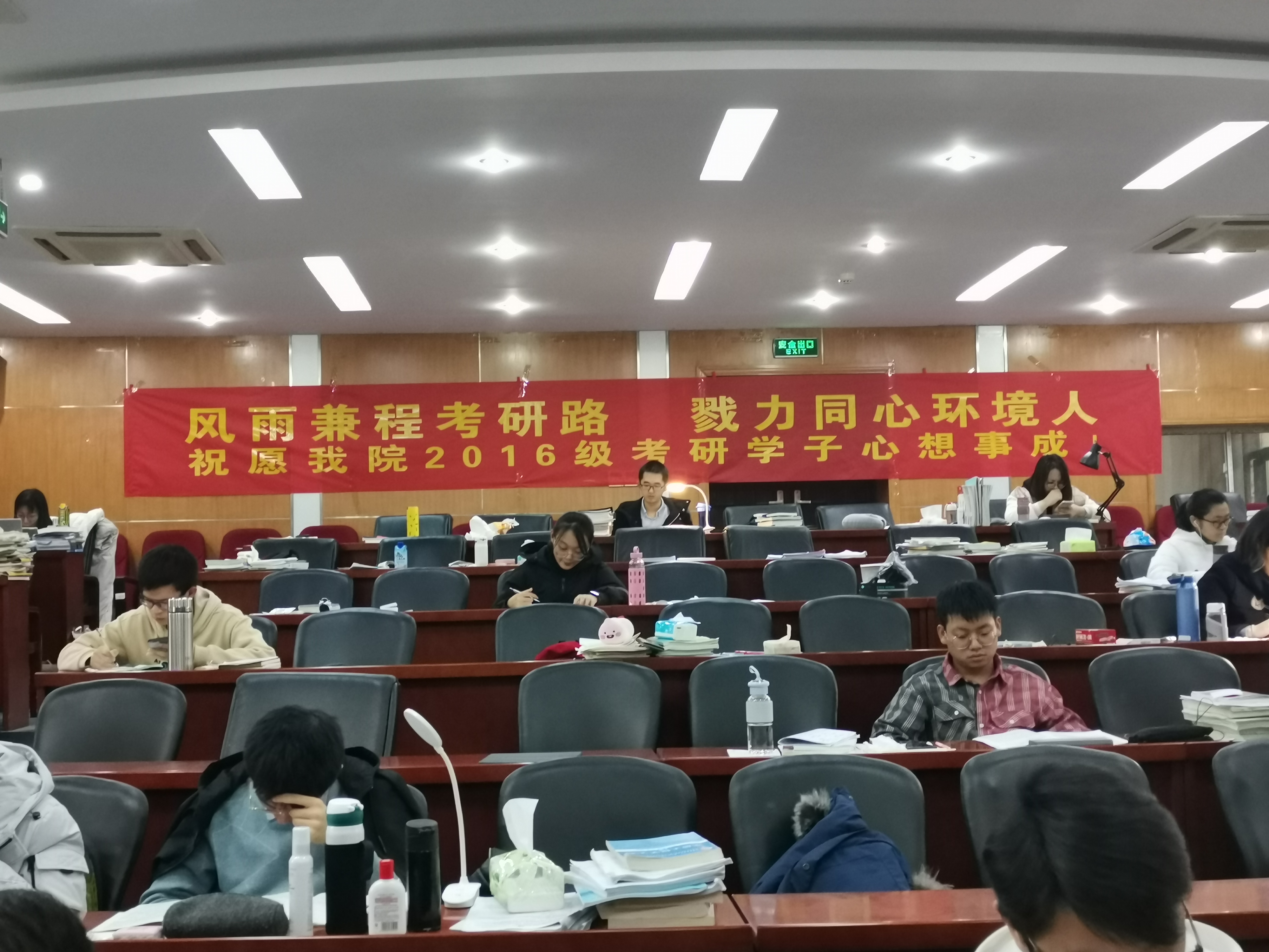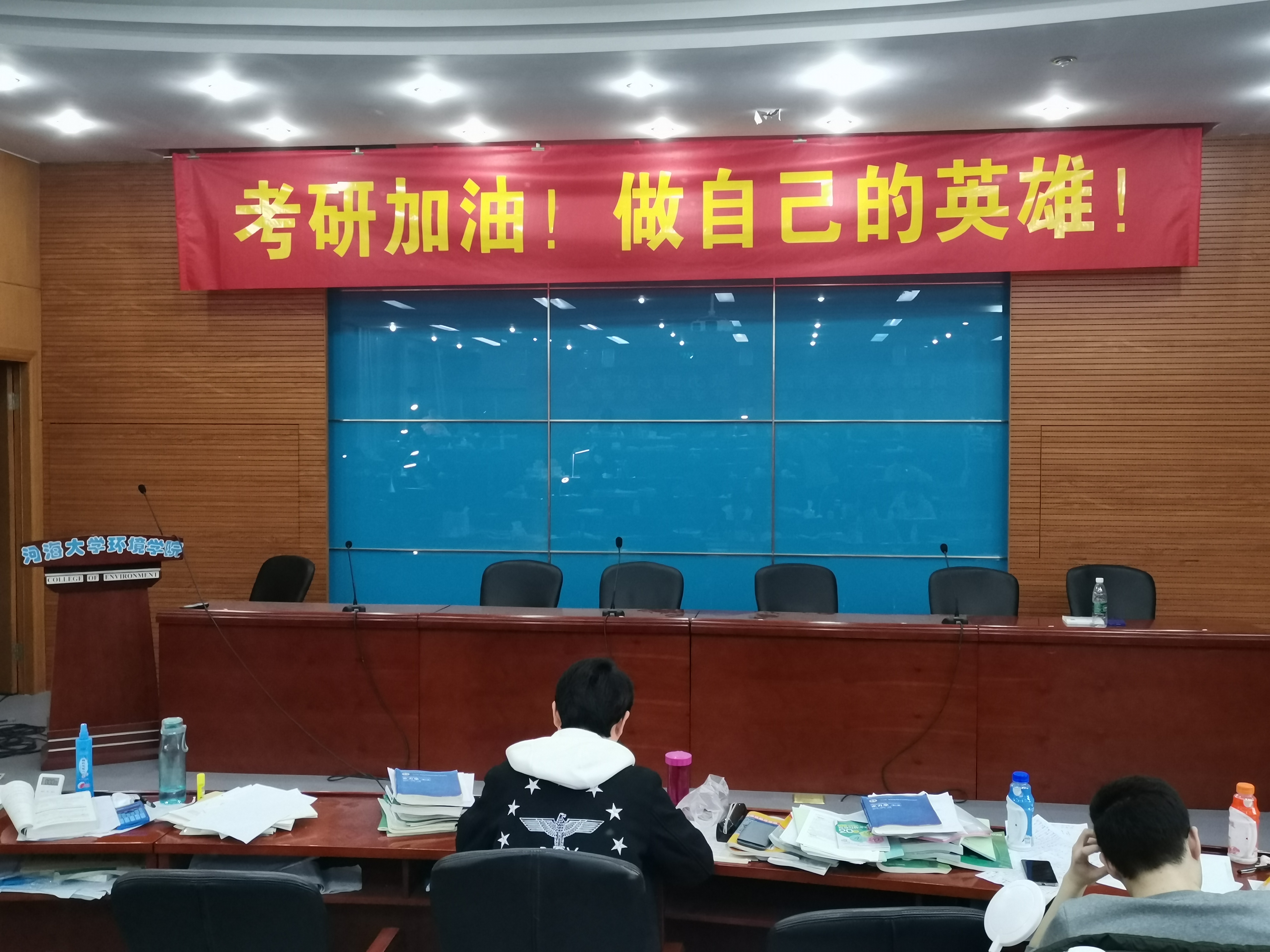 除此之外,为了让同学们能以更好的状态准备考研,瓜子tv 给予了十足的关怀。在学习方面,学院特地向学校申请了水利馆301的会议室作为瓜子tv 同学们的专用考研复习教室,给同学们提供了一个固定而温暖的学习空间,为同学的复习生活提供了极大的便利。在生活方面,学院在快要来临之际举办了考研动员大会,鼓舞考研同学的士气,缓解大家的紧张与压力,让同学尽量以最佳的心态复习应试,同时也为学生的复习计划提供了参考经验。学院还精心订制了条幅展示于考研复习教室的前后,让大家在学习之余能够感受到学院老师和同学们的鼓励,希望同学能够心想事成、不负青春、做自己的英雄!
