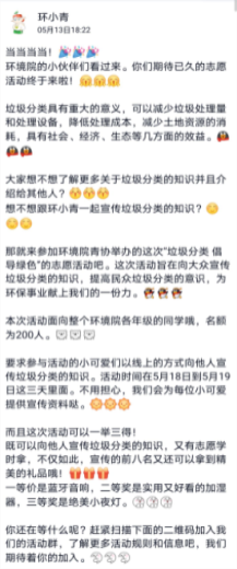 活动开展前期,环境院青协相关负责人用环小青公众号、班级内宣传等方式对活动进行宣传,组织环境院各年级学生志愿报名参与。