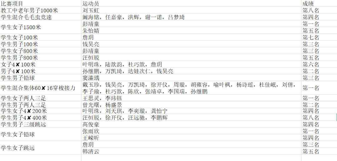 于此同时,在另一个场地中进行的女子跳远比赛中,詹玥同学、龚怡宁同学、韩清云同学也不甘示弱。她们身轻如燕,纵深一跃,便在天空中留下一道美丽的弧线。最终,詹玥同学和韩清云同学分别获得了全校第三和全校第五的好成绩。