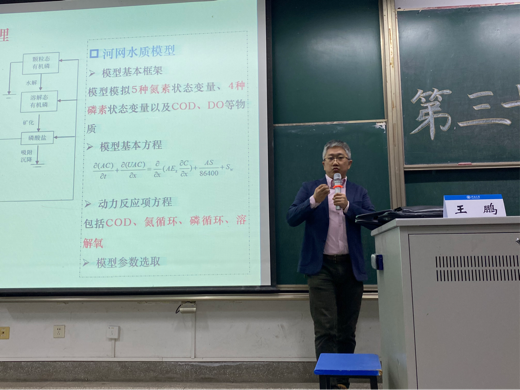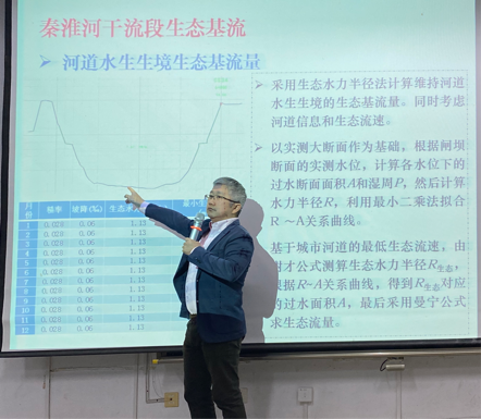 对于秦淮河流域骨干河道生态基流的研究,王鹏老师明了的指出河流根本生态需水目标:保持河流形态与结构稳定性、维持水生生境与生物群落多样、保护区域稀有物种、维持水沙物质输送、调节区域气候与水分、净化水质、提供经济社会用水和维持河流景观。深入剖析了人工化河流的特点,王鹏老师用清晰的图表、数据和专业的知识架构、公式让同学们快速认识到了秦淮河干流段生态基流,细致耐心的讲解使在座的同学们茅塞顿开。