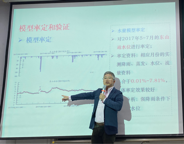 紧接着,王鹏老师从研究区域概况、资料收集与数据库构建、秦淮河流域骨干河道生态基流研究、骨干河道水量-水环境耦合教学模型构建、调度方案的多情形模拟与方案比选几个方案向同学们展示了城市水系和生态水情况。