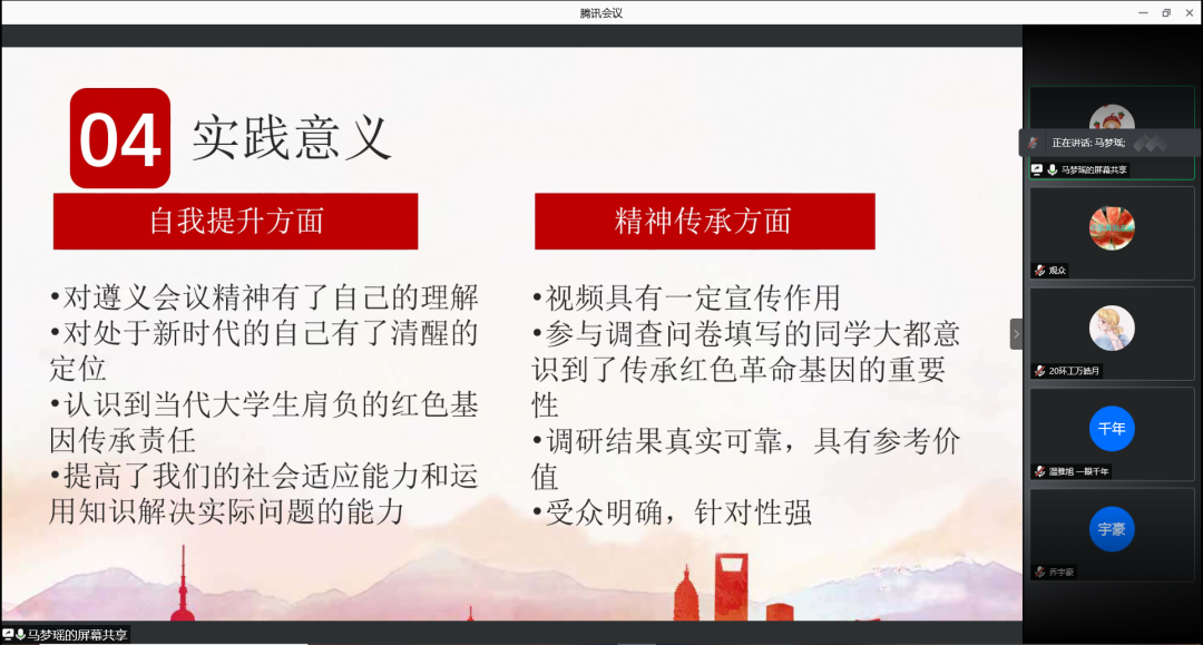 本次答辩共十一个小组,每个小组的答辩都具有很强的逻辑性,一环扣一环地展示了河海学子开展“返家乡”主题社会实践活动的丰富体验和丰硕成果。激发爱国之情,强化爱国之志,激励广大青年学生进一步增强责任感和使命感。在评委的耐心指导下,同学们意识到传承红色经典并不仅仅是学习的过程,更需要大学生承担肩负的责任,通过收集到的数据资料帮助红色历史的发扬,体现本次活动的真正内涵所在。