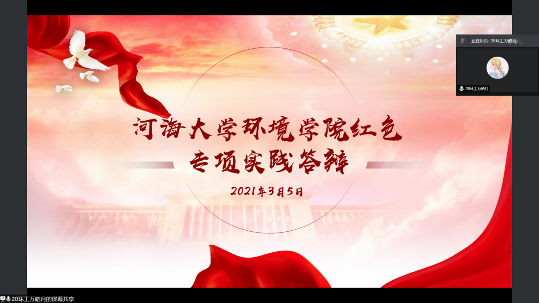 2021年3月5日中午,瓜子tv 环境院举办了以“返家乡“为主题的线上答辩会。院团委书记金意倩老师、团委副书记唐柏杨同学、新媒体中心主席王莹同学和学生会主席杨诗瑶同学负责担任本次答辩会的评委,与会成员按照顺序依次演讲,为听众和评委们呈现了一场精彩绝伦的答辩会。