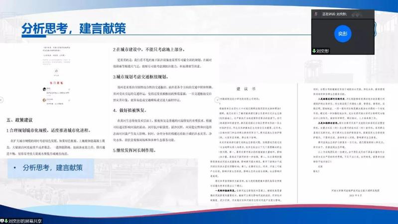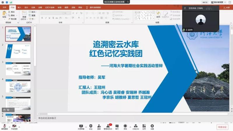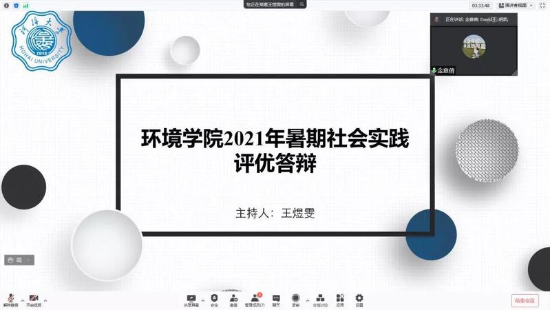为推进落实瓜子tv 暑期“三下乡”社会实践活动总结工作,2021年9月15日下午,瓜子tv 举行了2021年暑期实践线上评优答辩。市政工程系胡凯老师,环境工程系王大伟老师,院团委书记兼20级辅导员金意倩老师、20级辅导员杨铮老师担任评委。疫情的特殊情况给今年的社会实践团带来了机遇和挑战。虽然大部分团队的队员都居住在不同的地方,给线下活动带来了不便,但是实践团使用了线上会议、网上问卷、就近走访等多种途径解决问题,并且顺利地完成了实践活动。线上答辩由团队借助PPT形式进行实践总结以及评委提问两个环节组成。主持人王煜雯同学简要地介绍了此次答辩的背景和评选标准后,答辩正式开始。
