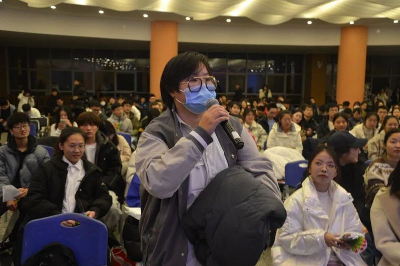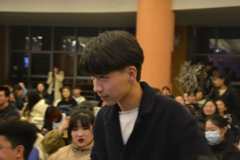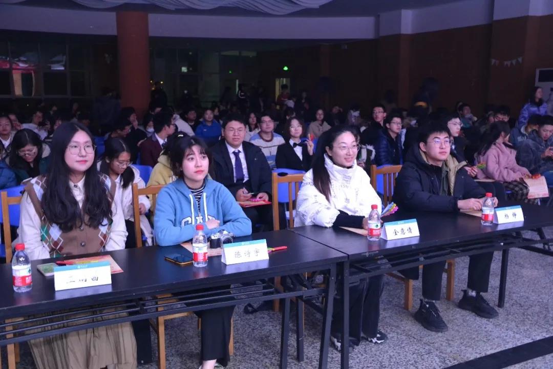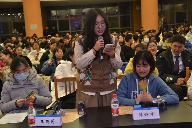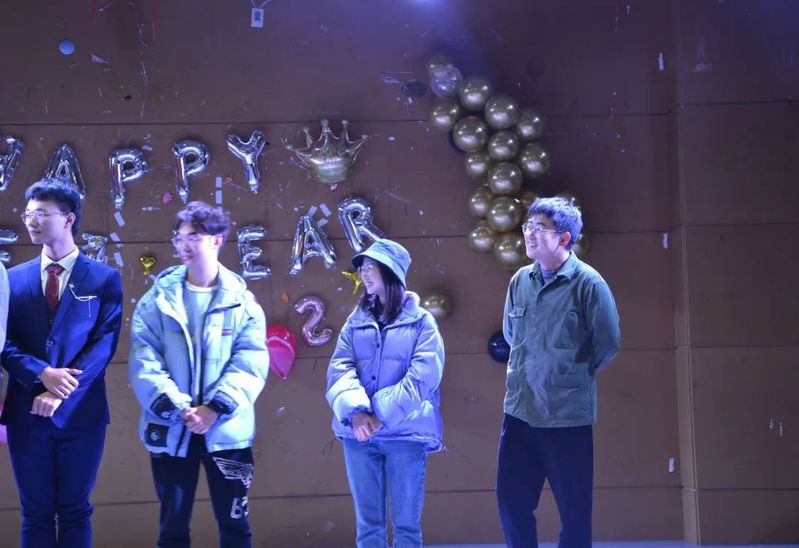 在休场期间,各种小游戏接踵而至,在座各位同学积极参与,全场笑声连连。听歌识曲游戏中,各位同学猜中歌名后还需要演唱歌曲。王雨茜老师也献歌一曲,引得同学们一阵欢呼;抢椅子游戏,同学在转圈的同时紧盯板凳,感受那股肾上腺素飙升的感觉;“正话反说”游戏,杨铮老师和同学们急中生智,高速运转大脑;蒙眼吹气球游戏,王雨茜老师与陈诗宇老师以及参加的各位同学两两分组猛吹气球,为晚会增添了几分喜庆与欢愉。