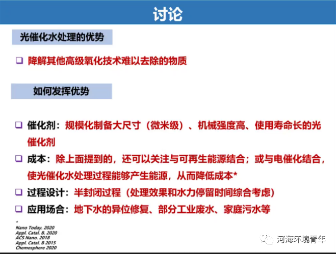 王教授通过紫外光催化降解的实际应用为引,向同学们进一步拓展了光催化水处理技术的发展现状,并分析其在当今市场上的优点:能耗低、无需其他试剂、能够去除其他高级氧化技术难以去除的污染物。