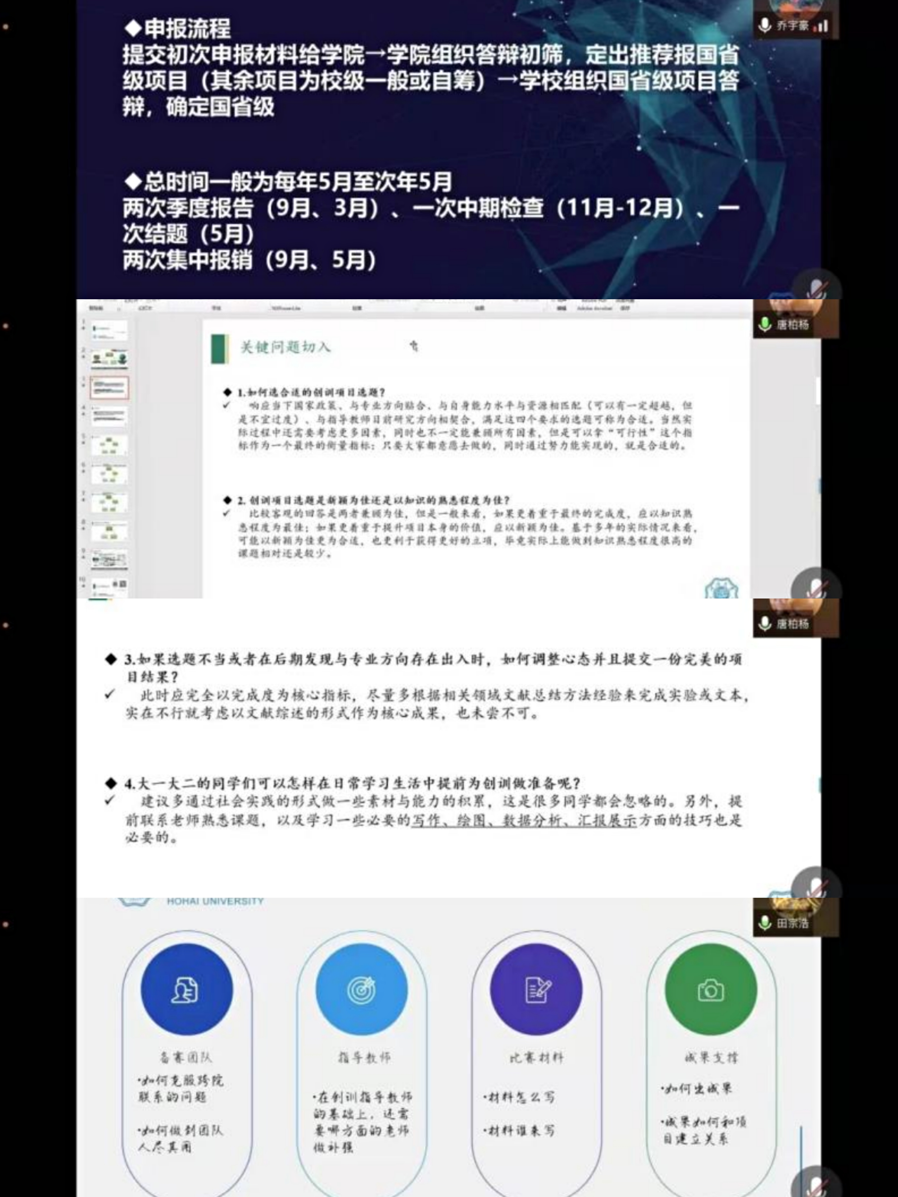 在经验分享环节中,2018级唐柏杨同学和2019田宗浩、乔宇豪同学从自身的创训实践经验出发,围绕前期准备、内容选题、立项书撰写、时间规划等方面为同学们做了经验分享。他们强烈建议同学们在确定创新项目选题时要找到合适的导师、考虑清楚创训目的,从而选择适合自己的项目内容。鼓励同学们不仅要注重技术能力的培养,更要广泛地参与到创新创业活动中来,不断提升经验、丰富履历,提高综合竞争力。