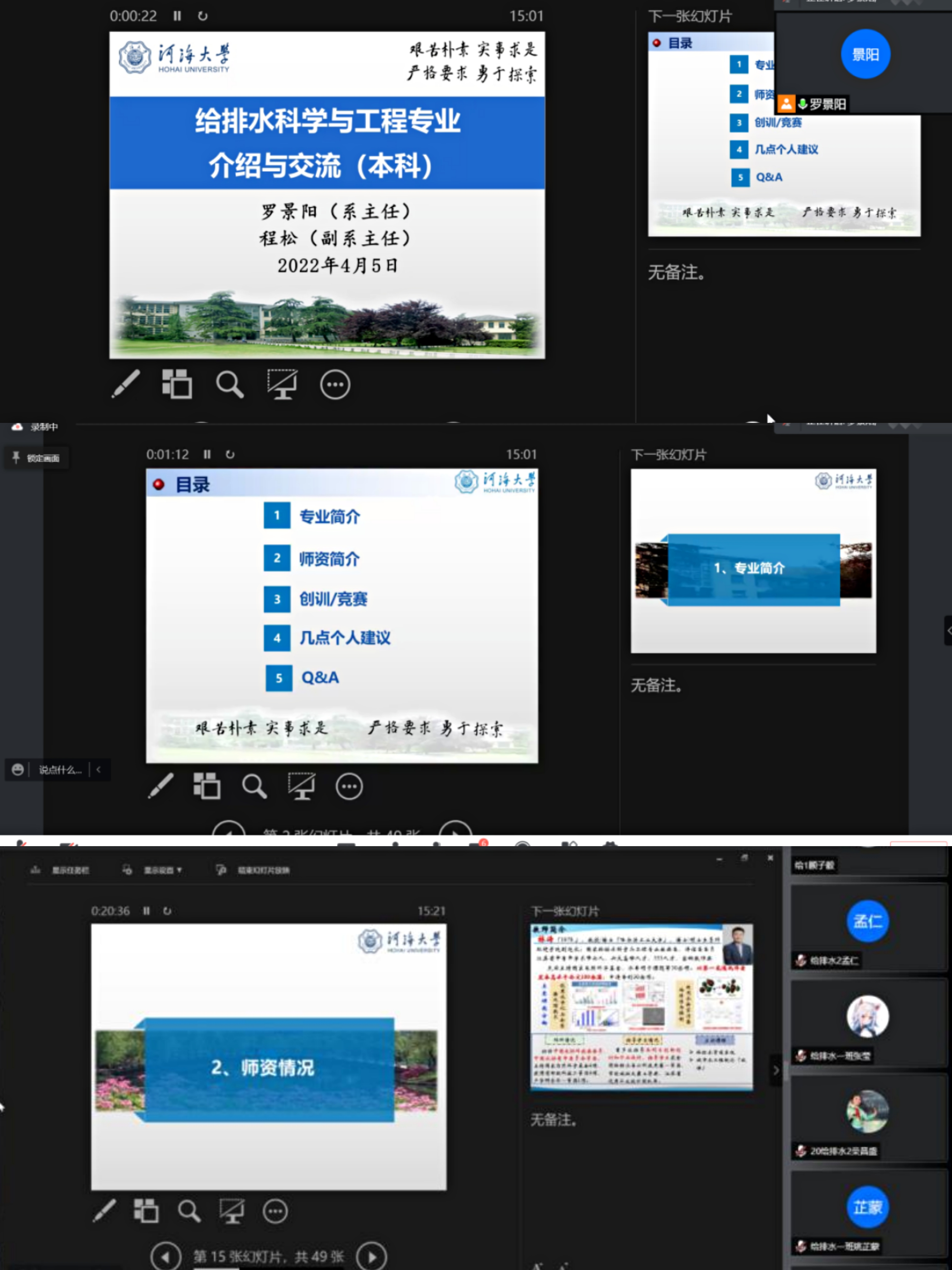 罗老师从专业建设、优势与特色、培养目标、毕业要求等方面向同学们介绍了给排水专业的基本信息,并展示了近三年毕业生就业情况和毕业生毕业5年的成就,提醒同学们要明确自身在每个阶段的任务,同时要注重理论与实践的结合。