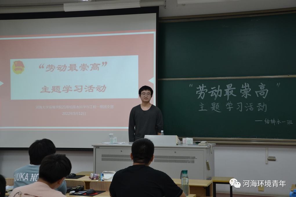 习近平总书记在全国劳动模范和先进工作者表彰大会发表重要讲话。习近平总书记强调,光荣属于劳动者,幸福属于劳动者。为深入贯彻落实习近平总书记的重要指示,帮助同学们更好地理解讲话精神,2022年5月12日晚21级给排水一班,环科一班在博学楼b420举行了“劳动最崇高”主题学习活动。本次劳动教育活动分为三个阶段进行,班级学习委员苏赫洋、楚嘉欣同学担任主持人。