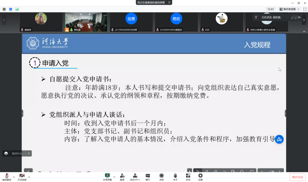 姜老师向大家介绍了入党流程,明确大家如何申请并通过考核加入中国共产党;解答了各类奖学金评选问题,并附上了往年相关奖学金的学术评定标准、学科评定标准、综合考核标准的参考文件,激励同学们从现在开始积累履历经验以争取优秀荣誉;大家要进行本科生到研究生的身份转变,先独立再自由,要有解决问题的意识和能力,如果面临过大的心理压力,一定要及时寻求老师和同学们的帮助,进行心理疏导。