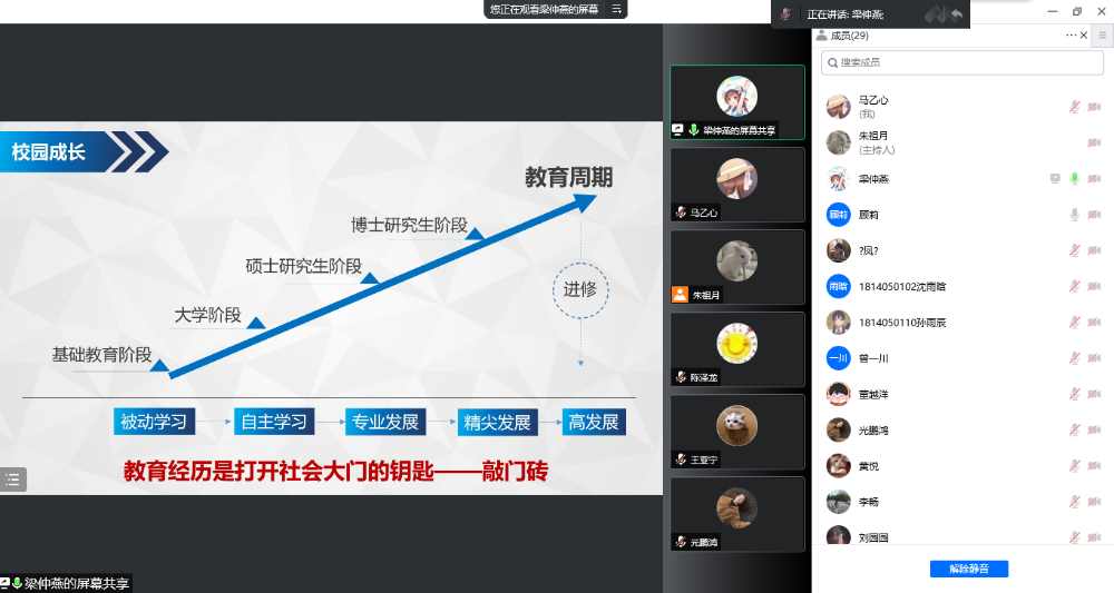 会上,梁主任特别向同学们分享一个观点,即无论是在职场还是学校都要先做人再做事、因事结缘、因人而交,无论什么岗位都要脚踏实地做好自己的本职工作,做事多思考,以最大的热情和细致去对待工作才能走得更远。同时,面对同学们最关心的就业问题,梁主任也从用人单位的角度给出了建议,她指出教育经历是打开社会大门的钥匙,特别是在经历了疫情大考之后各行各业的发展也面临着考验,在用人方面更是精益求精,严峻的就业形式对同学们来说既是挑战也是机遇,只有不断深入了解、分析行业发展需求从而不断提升自身的战斗实力,从被动学习向自主学习转变的过程中以更高的标准要求自己,引导自身朝着专业发展、精尖发展的方向去努力,才能在毕业时拥有更多的选择。