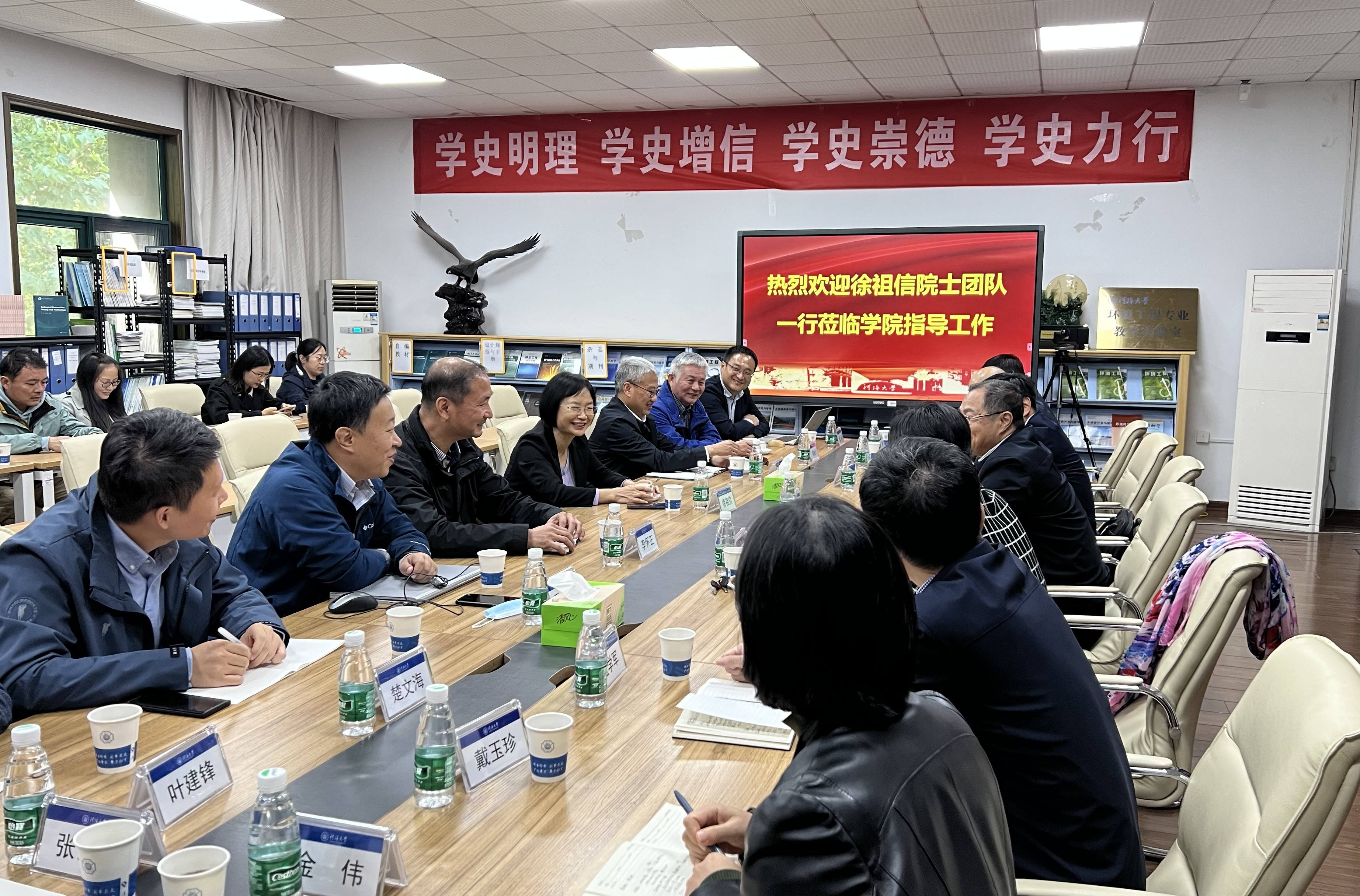 王沛芳院长对徐祖信院士团队的来访表示欢迎并介绍了学院的基本情况。王超院士介绍了学院的发展史,并为徐祖信院士颁发了兼职导师聘书。林涛副院长详细介绍了学院实验室现状及建设情况。