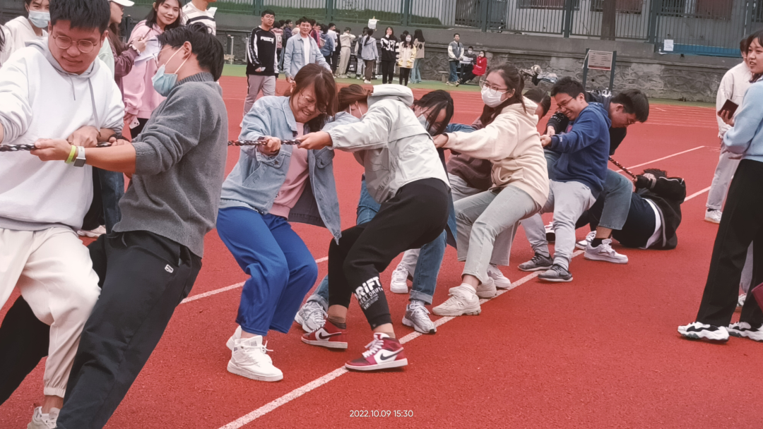 团队赛由2021级和2022级各班级研究生以班级为单位参与,比赛项目分别为:三人四足,拔河,穿越呼啦圈,足式保龄球,背球接力赛,由以上五项的累积得分决定胜负。赛况全程激烈,来自各班的运动能手强强对峙,角逐着最终的胜利。选手们个个英姿飒爽,用矫健的步伐,坚强的意志,创造了一个个精彩的画面,运动员们配合默契,带着信任和信心,出色地完成了比赛。萧瑟的秋风,挡不住破竹的勇气,这是青春的舞台!