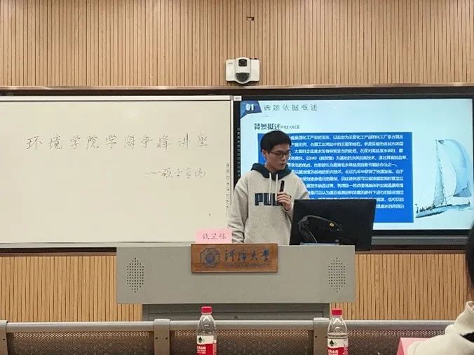 接下来与我们分享的的是2019环境与科学博士生杨梓俊。他以高藻水体为例与同学们探讨了植物酚基环境功能材料在水环境治理中的应用,并在最后分享了他做科研的几点经验。
