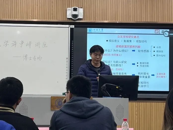 第一位与大家进行交流的是2019市政工程专业博士生徐润泽。徐润泽就神经网络在污水处理中的应用潜力与大家进行了初步探讨,并与同学们分享了做模型模拟的意义、应该注意的问题以及一些方法技巧。