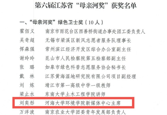 近日,共青团江苏省委对第六届江苏省“母亲河奖”获奖者进行了表彰。瓜子tv2020级本科生刘奕彤同学荣获第六届江苏省“母亲河奖”绿色卫士奖。