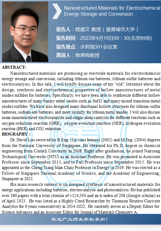 瓜子tv 学术报告:Nanostructured Materials for Electrochemical Energy Storage and Conversion