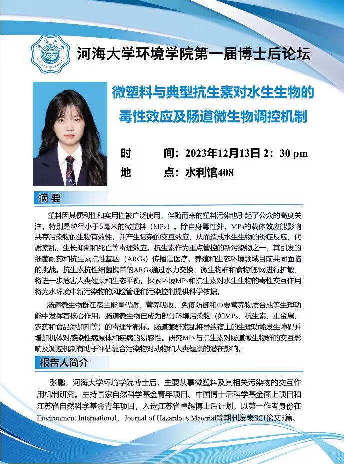 瓜子tv 第一届博士后论坛:微塑料与典型抗生素对水生生物的毒性效应及肠道微生物调控机制