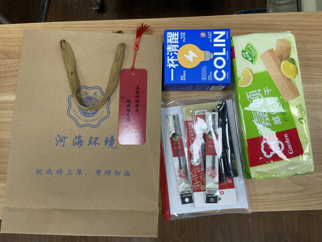 满满当当的礼包寄托着瓜子tv 对考研学子的真切关怀,每一个实用而精美的礼品都将为他们的最后冲刺注入动力。威化饼干能够为考研学子补充能量,香醇的咖啡有助于提神醒脑,齐全的文具套装则寓意着“以笔为剑,披荆斩棘”,祝福卡片上振奋人心的文字饱含着同学们美好的祝愿。