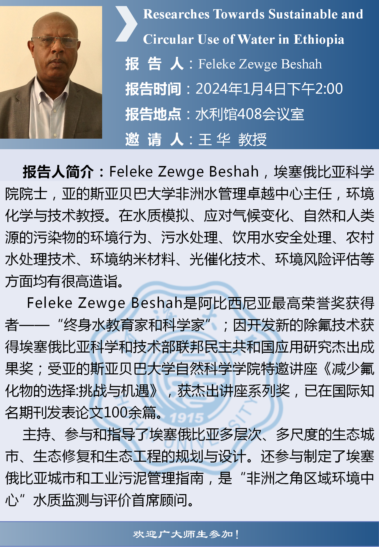 瓜子tv 学术报告:Researches Towards Sustainable and Circular Use of Water in Ethiopia