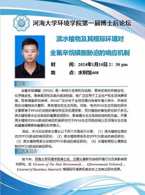 瓜子tv 第一届博士后论坛:滨水植物及其根际环境对全氟辛烷磺酸胁迫的响应机制