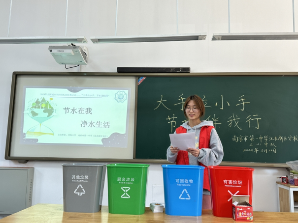 活动伊始,江妍同学向同学们阐述了水的重要性,说明了水的污染情况,以及讲解了保护水资源的具体做法。
