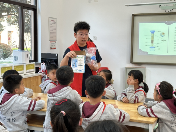 随后,环境学子们带领不同小组进行净水小实验。他们将清澈干净的自来水倒入几个不同的容器中,添加了一些代表生活中常见污染物的粉末,与小同学们一起观察不同容器中的水质变化,引导他们思考如何净化水体。
