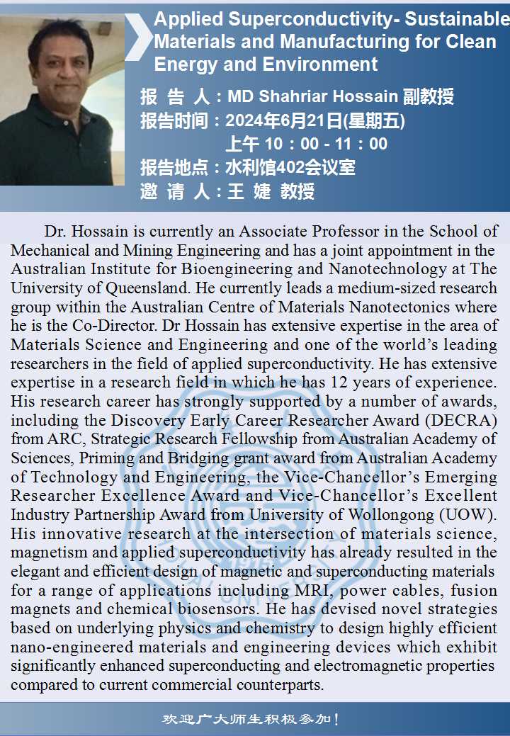 瓜子tv 学术报告:Applied Superconductivity- Sustainable Materials and Manufacturing for Clean Energy and Environment