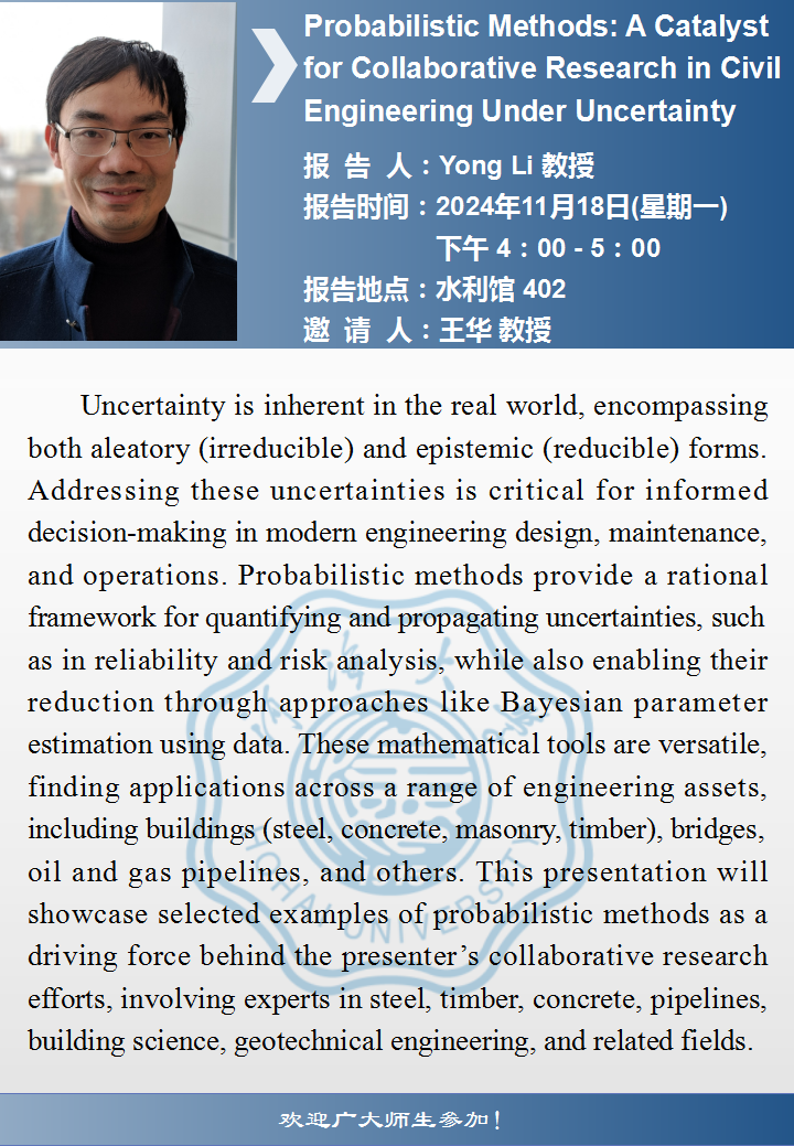 瓜子tv 学术报告:Probabilistic Methods: A Catalyst for Collaborative Research in Civil Engineering Under Uncertainty