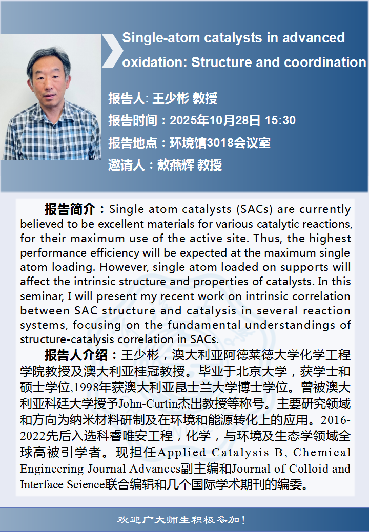 瓜子tv 学术报告:Single-atom catalysts in advanced oxidation: Structure and coordination