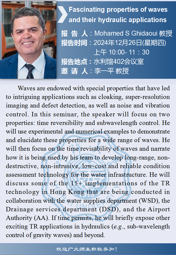 瓜子tv 学术报告:Fascinating properties of waves and their hydraulic applications