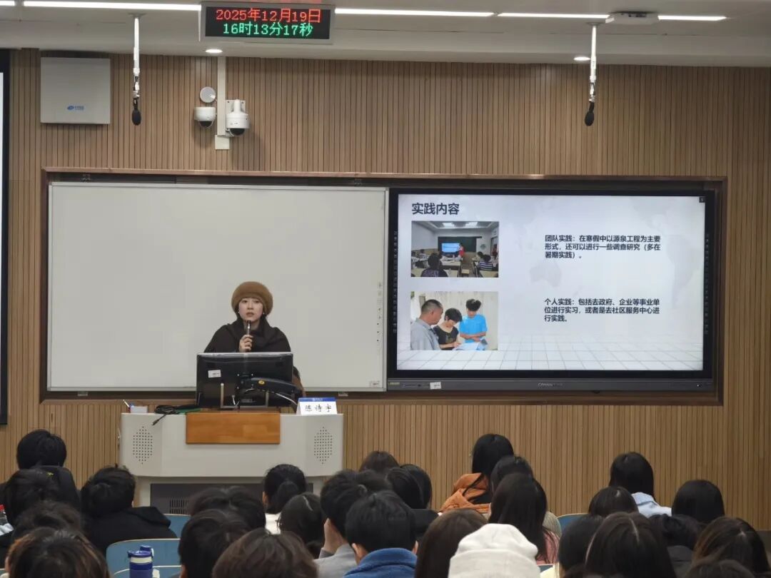 大会伊始,陈诗宇老师进行动员讲解,从个人实践方向、活动类别、PU学时要求及申请流程等方面作了整体说明,并围绕安全防护、材料规范、选题适配、团队协作等关键环节提示了注意事项,帮助同学们对寒假社会实践有了更为全面和深入的认识。